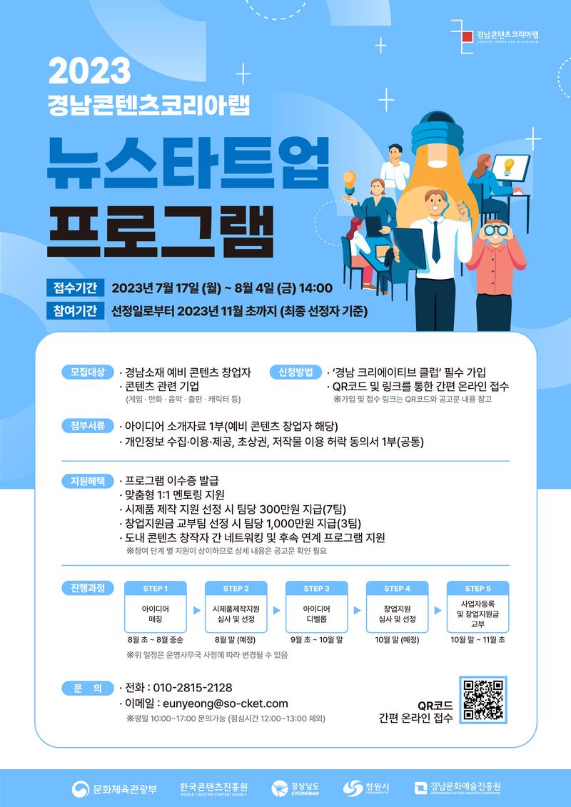 2023 경남콘텐츠코리아랩 뉴 스타트업 프로그램 참여 모집 공고 (재)경남문화예술진흥원 경남콘텐츠코리아랩에서는 도내 콘텐츠 창작자 커뮤니티 형성 및 협업문화 확대와 콘텐츠 분야 창업 활성화 도출을 위해 「2023 경남콘텐츠코리아랩 뉴 스타트업 프로그램」참여 모집을 아래와 같이 추진하오니 많은 관심과 참여 바랍니다. 1. 공고기간: 2023. 7. 17. (월) \~ 8. 4. (금) / 19일간 2. 접수기간: 2023. 7. 17. (월) \~ 8. 4. (금) 14:00까지 ※마감시간 이후 접수 불가 3. 접 수 처 : 경남 크리에이티브 클럽 가입 후 신청폼 및 첨부서류 제출 4. 접수방법 - 경남콘텐츠 창작자 네트워크 플랫폼 '경남 크리에이티브 클럽' (https://www.didisam.com/site/gcclub) 필수 가입 - 프로그램 신청홈 (https://walla.my/newstartup2023) 내 필수 항목을 작성하여 간편 접수 진행 5. 지원혜택 - 프로그램 이수증 발급 - 맞춤형 1:1 멘토링 지원 - 시제품 제작 지원 선정 시 팀당 300만원 지급 (7팀) - 창업지원금 교부팀 선정 시 팀당 1,000만원 지급 (3팀) - 도내 콘텐츠 창작자 간 네트워킹 및 후속 연계 프로그램 지원 공고문_2023_경남콘텐츠코리아랩_뉴_스타트업_프로그램_모집_공고.hwp (77.637 KiB)