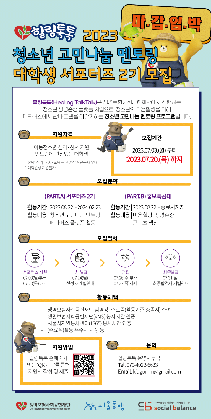 ● 문의 사항 - 힐링톡톡 운영사무국 (소셜밸런스) Tel. 070-4922-6633 Email. kiugomm@gmail.com