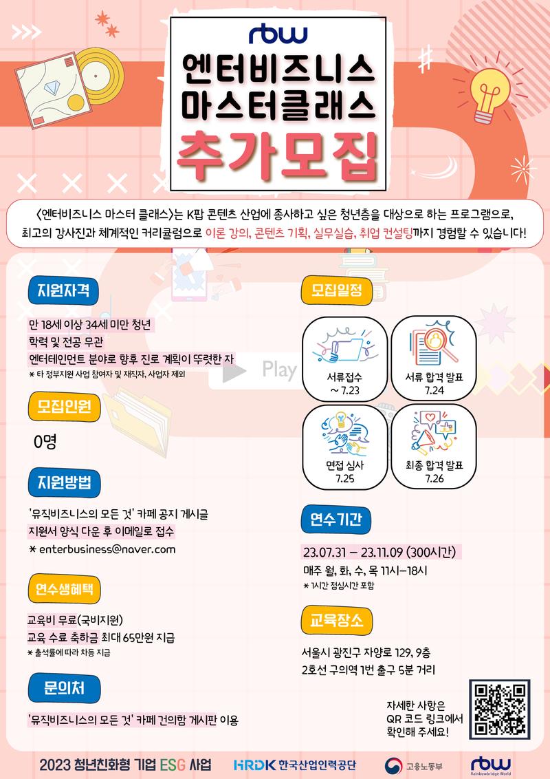 🔥2023 엔터비즈니스 마스터 클래스 4기 추가 모집 공고 (\~23.07.23)🔥 엔터테인먼트 산업 전반의 이론부터 실무까지! 모두 배워 볼 수 있는 유일무이 교육 프로그램 [엔터비즈니스 마스터 클래스 4기] 추가 모집을 시작합니다! * 해당 교육 과정은 음반 프로듀서 양성 과정이 아닌 엔터테인먼트 스태프 (기획, A&R, 신인개발, 마케팅, 콘텐츠 제작 등)를 희망하는 사람들을 위한 과정입니다. [엔터비즈니스 마스터 클래스 4기]는 K팝 콘텐츠 산업에 특화된 인재 양성을 위해 앨범 기획, 앨범 제작, 영상 제작, 홍보 마케팅 등 팀 프로젝트로 진행해 볼 수 있으며 각 분야에서 활발하게 활동하고 있는 현직자로 구성된 최고의 강사진과 기본부터 심화까지 아우르는 탄탄한 커리큘럼을 자랑합니다. 또, 원활한 취업을 위해 이력서, 자기소개서, 면접 등 까지 프로그램에 들어가 있어 취업 역량을 강화시킬 수 있습니다.