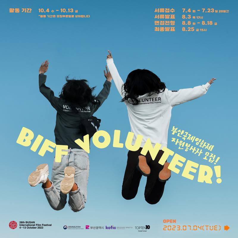 1. 주요일정 (1) 모집기간 : 7월 4일(화) 17시 – 7월 23일(일) 23시 59분 (2) 서류합격자 발표 : 8월 3일(목) (3) 면접전형 : 8월 8일(화) - 8월 18일(금) (4) 최종합격자 발표 : 8월 25일(금) 15시 이후 (5) 활동기간 : 10월 4일(수) - 10월 13일(금) 2. 모집대상 (1) 성인이라면 누구나 지원 가능합니다. (2004년 12월 31일생까지 지원 가능) (2) 외국인 등록증이 있고, 한국어 소통에 문제없는 외국인도 지원이 가능합니다. 3. 자원봉사자에 대한 지원 - 1365 자원봉사포털에 봉사 시간을 등록하여 봉사 실적을 인증 받을 수 있게 해드립니다. - 공식 일정(자원봉사자 행사, 교육 일정 등)에 참여하기 위해 부산 외 지역에서 오시는 경우, 교통비를 지원합니다. - 자원봉사자 유니폼, 가방, 배지를 지급합니다. - 활동 종료 후 참여증서를 지급합니다. - 식비와 교통비를 지원합니다. (숙박은 제공하지 않습니다.) - 대학생 또는 직장인이 교육과 활동에 참가하기 위해 필요한 경우 소속 대학 또는 회사에 제출할 수 있는 협조요청공문을 발급해 드립니다. 4. 문의 부산국제영화제 관객서비스팀 자원봉사운영 담당 ☏. 051-709-2088\~2089 / volunteer@biff.kr ♥ 자세한 사항은 volunteer.biff.kr을 참고하세요.♥
