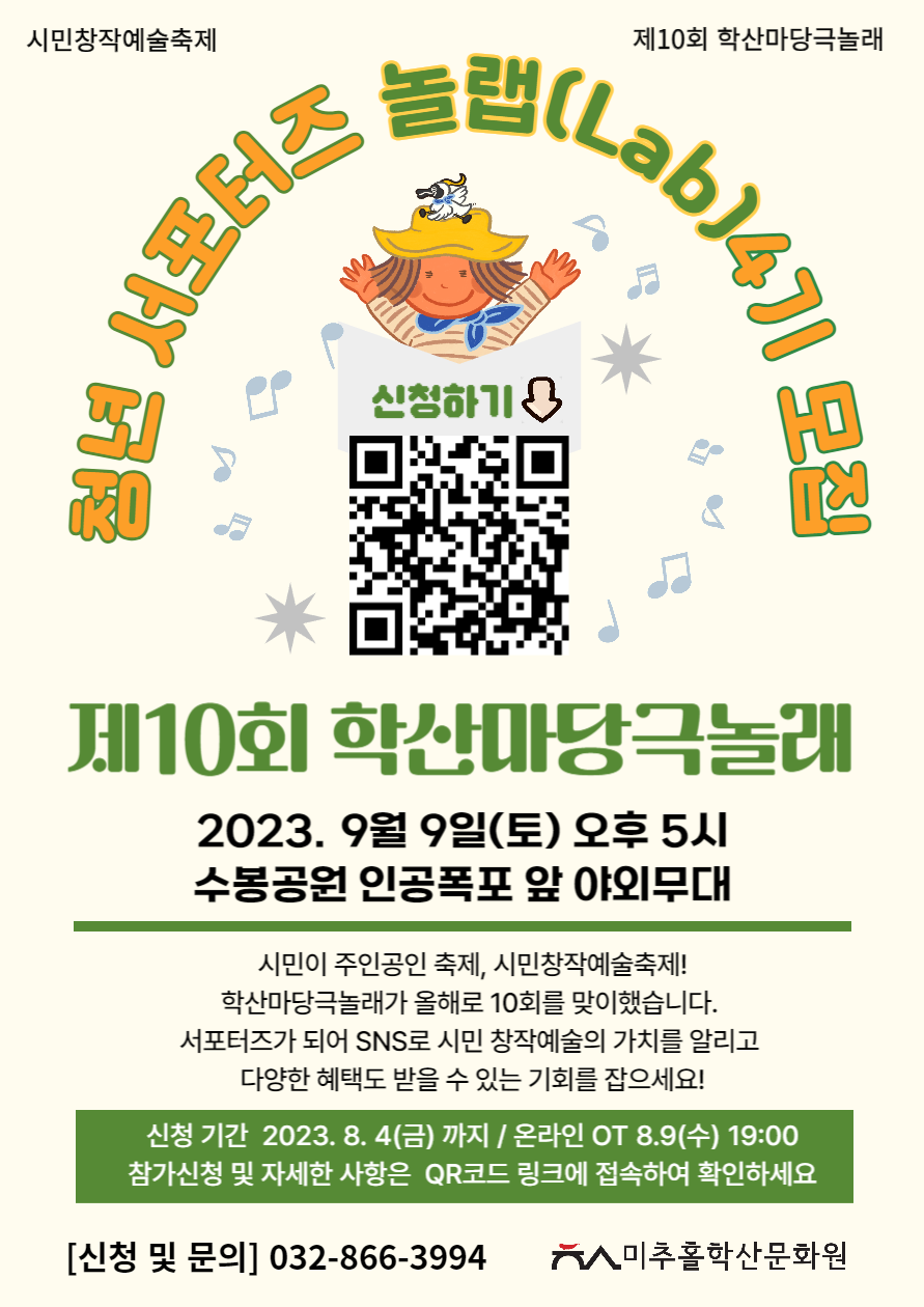 올해로 10회를 맞이하는 학산마당극놀래 축제를 함께 즐기고, 서로 나누고, 같이 채워 갈 학산 청년 서포터즈 놀랩(Lab) 4기를 모집합니다.
