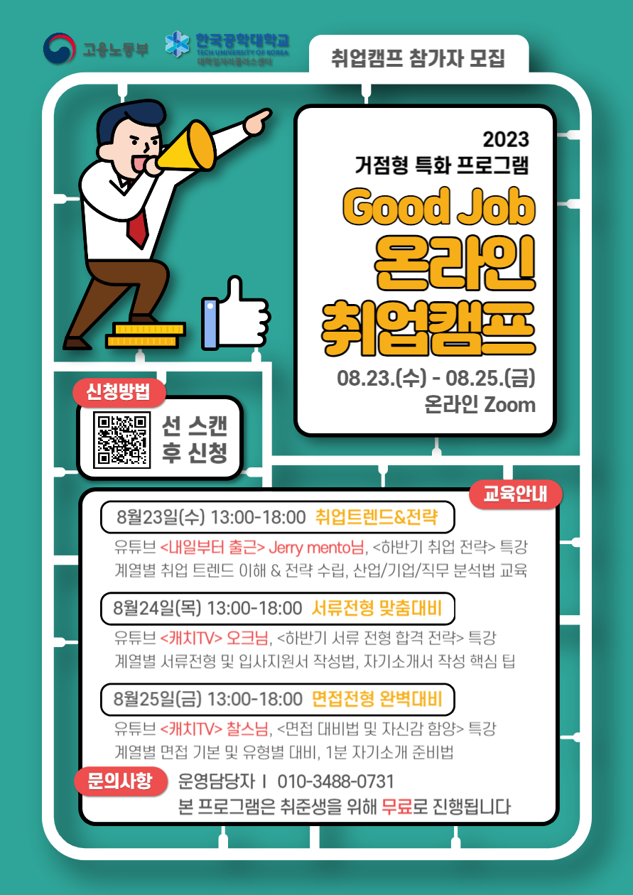 고용노동부와 한국공학대학교 대학일자리플러스센터에서 #대학생 #졸업생 #취준생 #청년 들의 성공 취업을 위해, 아래와 같이 <2023 Good Job 온라인 취업캠프>를 기획하였으니 많은 관심과 참여 바랍니다.