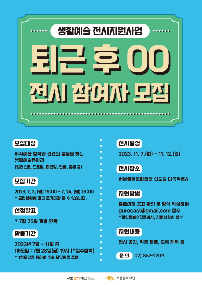 ■ 모집대상 - 시각예술 창작과 관련된 취미 활동을 하는 동아리 ■ 모집기간 - 2023. 7. 3. (월) \~ 7. 24. (월) * 모집현황에 따라 조기마감 될 수 있습니다. ■ 활동기간 - 2023년 7월 \~ 11월 중 1차모임 : 7월 28일(금) 19시 * 1차모임을 통하여 추후 모임일정 조율 ■ 전시일정 - 2023. 11. 7.(화) \~ 11. 12.(일) ■ 지원방법 홈페이지 확인 후 신청서작성하여 gurocast@gmail.com 접수