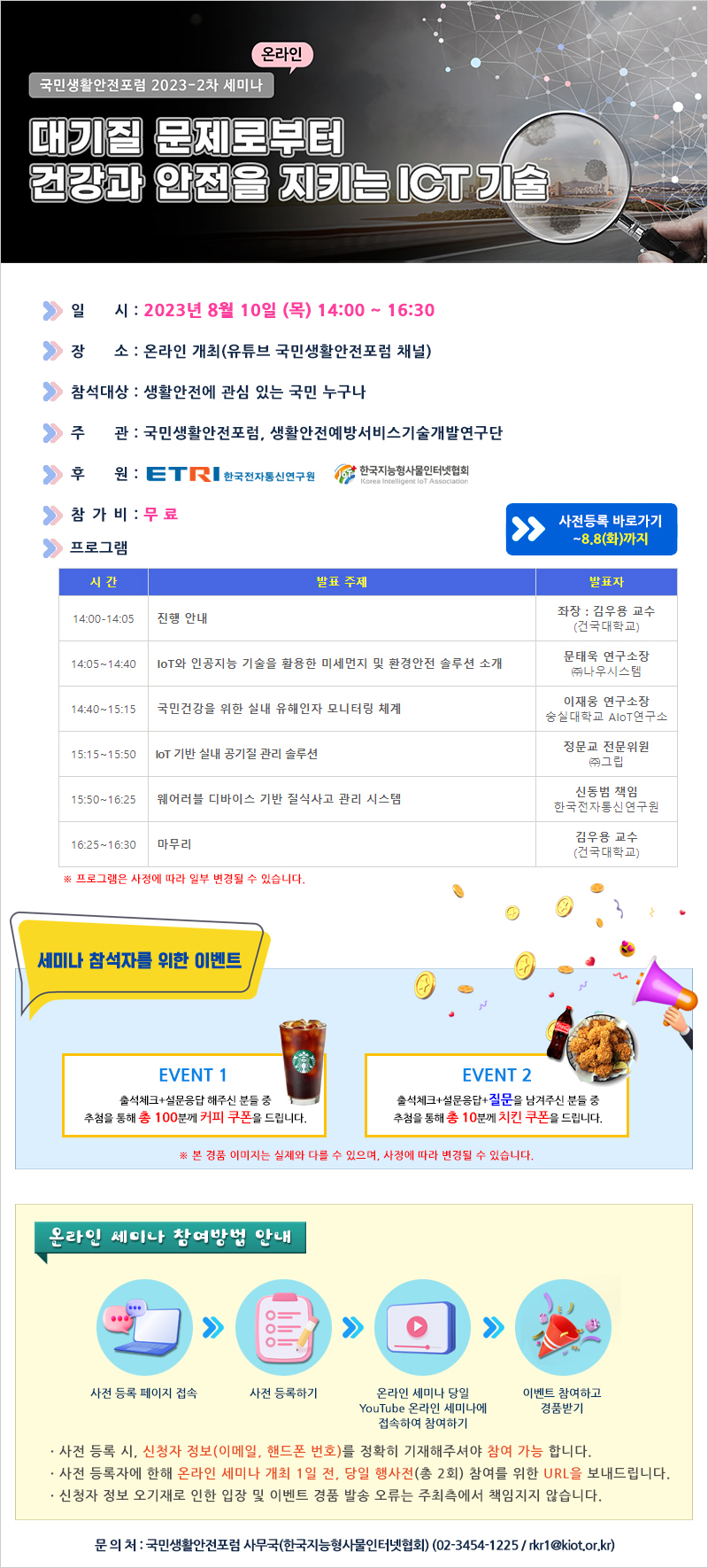 국민생활안전포럼이 주관하고 한국지능형사물인터넷협회가 후원하는 2023-2차 국민생활안전포럼 세미나입니다. 이번 세미나는 "대기질 문제로부터 건강와 안전을 지키는 ICT 기술" 이라는 주제로 여러분을 찾아뵙겠습니다. 많은 관심과 참여 부탁드립니다.