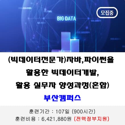 [더조은아카데미 - 부산캠퍼스] 훈련과정 - (빅데이터전문가) 자바,파이썬을 활용한 빅데이터개발,활용 실무자 양성과정 교육일정 - 2023년 07월 31일 \~ 2024년 01월 04일 교육시간 - 09:30 \~ 18:30 (주5일 수업 / 일일 8시간) 교육비용 - 전액국비지원 교육문의 - (통합) 02-703-7025 / ocm7607@naver.com