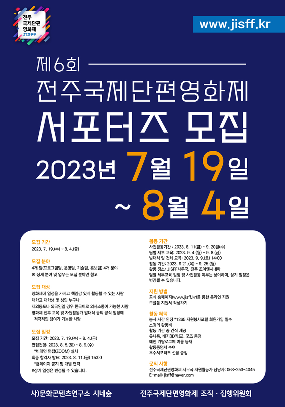 활동기간 사전활동기간 : 2023년 8월 11일(금) \~ 9월 20일(수) 팀별 세부 교육 : 2023년 9월 4일(월) \~ 9월 8일(금) 발대식 및 전체 교육 : 2023년 9월 9일(토) 14:00 활동기간 : 2023년 9월 21일(목) \~ 9월 25일(월) 활동장소 : JISFF사무국, 전주 조이앤시네마 팀별 세부교육 일정 및 사전활동 여부는 상이하며, 상기 일정은 변경될 수 있습니다.