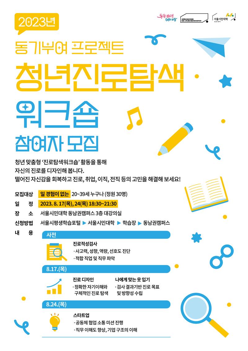 ○ 모집개요 - 청년 맞춤형 '진로탐색워크숍' 활동을 통해 자신의 진로를 디자인해 봅니다. 떨어진 자심감을 회복하고 진로, 취업, 이직, 전직 등의 고민을 해결해 보세요! ○ 기간 및 일정 - 2023. 7. 18. \~ 8. 16. ○ 지원자격 - 일 경험이 없는 20\~39세 누구나 ○ 모집인원 - 30명 ○ 활동내용 - 홍보 포스터 교육내용 참고 ○ 접수방법 - 일 경험 없음 : 서울시평생학습포털(https://url.kr/akyx52)) 신청 ○ 혜택내역 - 교육비 전액 지원, 수료증 발급 ○ 문의 - ☏ 02-442-6825