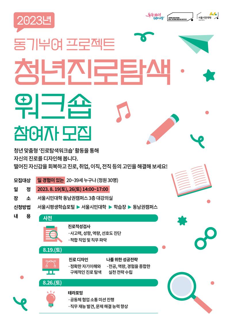 ○ 모집개요 - 청년 맞춤형 '진로탐색워크숍' 활동을 통해 자신의 진로를 디자인해 봅니다. 떨어진 자심감을 회복하고 진로, 취업, 이직, 전직 등의 고민을 해결해 보세요! ○ 기간 및 일정 - 2023. 7. 18. \~ 8. 18. ○ 지원자격 - 일 경험이 있는 20\~39세 누구나 ○ 모집인원 - 30명 ○ 활동내용 - 홍보 포스터 교육내용 참고 ○ 접수방법 - 일 경험 있음 : 서울시평생학습포털(https://url.kr/4slg67)) 신청 ○ 혜택내역 - 교육비 전액 지원, 수료증 발급 ○ 문의 - ☏ 02-442-6825