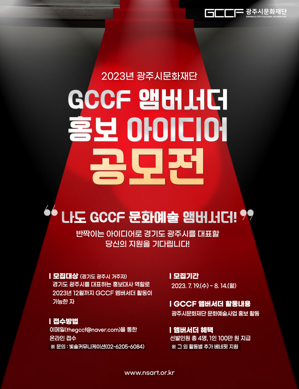 ✅모집대상 - 광주시 거주자 만 20세 이상 누구나 - 광주시 문화예술 홍보 활성화를 위해 적극적인 활동이 가능한 자 - 광주시에 적합한 홍보방안에 대한 참신하고 기발한 아이디어 제시 - 요즘 트렌드에 밝고 문화재단의 사업과 문화예술 분야에 관심이 있는 자 - 2023년 12월까지 GCCF앰버서더 활동이 가능한 자