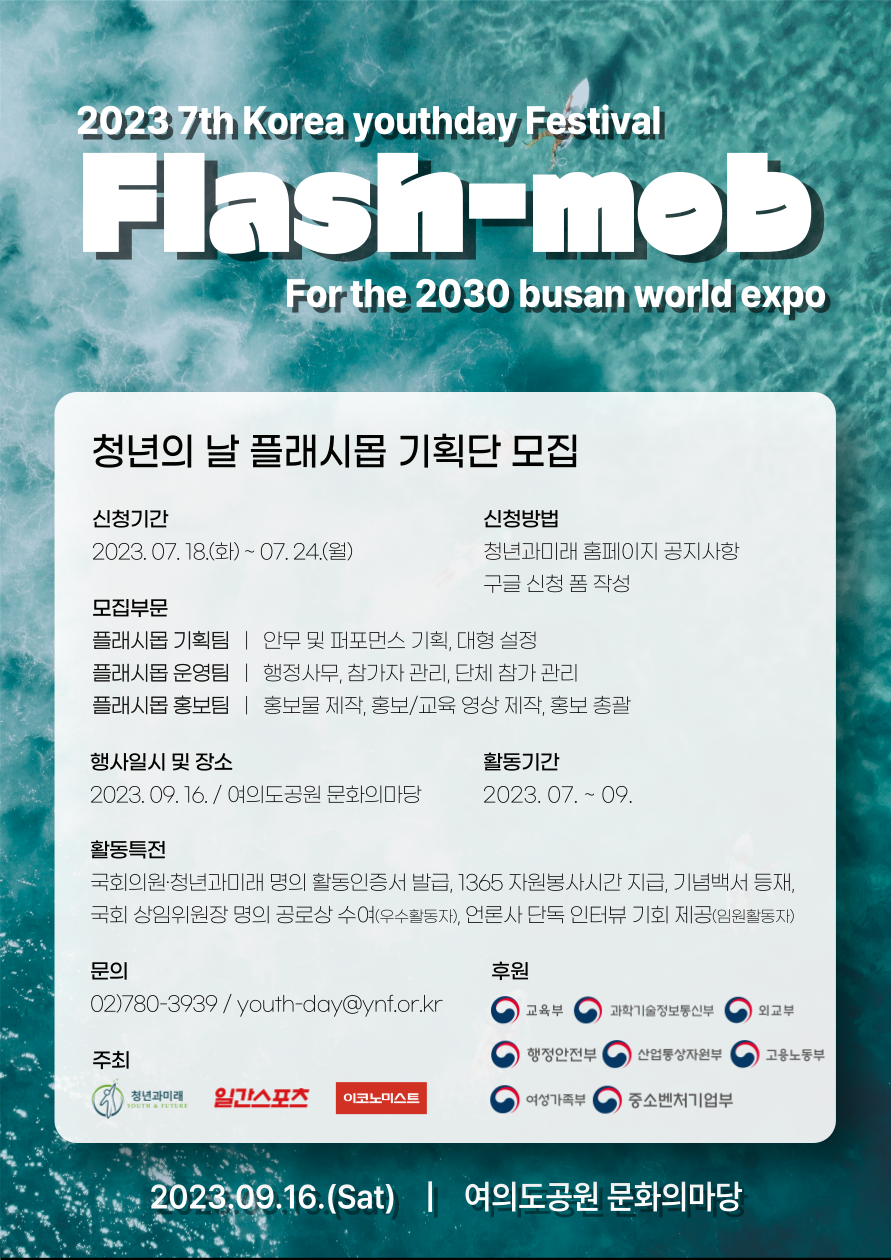 🌊[2023 제7회 대한민국 청년의 날] 플래시몹 기획단 모집🌊 💙주최 (사)청년과미래, 일간스포츠, 이코노미스트 💙모집대상 만 19세 이상 대한민국 청년 누구나 💙모집부문 플래시몹 기획팀 _ 안무 및 퍼포먼스 기획, 대형 설정 플래시몹 운영팀 _ 행정사무, 참가자 관리, 단체참가관리 플래시몹 홍보팀 _ 홍보물 제작, 홍보/교육 영상 제작, 홍보 총괄 💙행사일시 및 장소 2023년 9월 16일, 여의도공원 문화의마당 💙활동기간 2023년 7월\~9월 💙신청기간 2023년 7월 18일\~7월 24일 💙지원방법 구글 신청 폼 작성: https://docs.google.com/forms/d/e/1FAIpQLScDWkafc33qPBtZ3vKEZaPuy9TvCax2wU7YeZ4W3tgb2giQTw/viewform?usp=sharing 💙활동특전 국회의원·청년과미래 명의 활동인증서 발급, 1365 자원봉사시간 지급, 기념백서 등재, 국회 상임위원장 명의 공로상 수여(우수활동자), 언론사 단독 인터뷰 기회 제공(임원활동자) 💙문의 youth-day@ynf.or.kr 02-780-3939 010-7518-5572