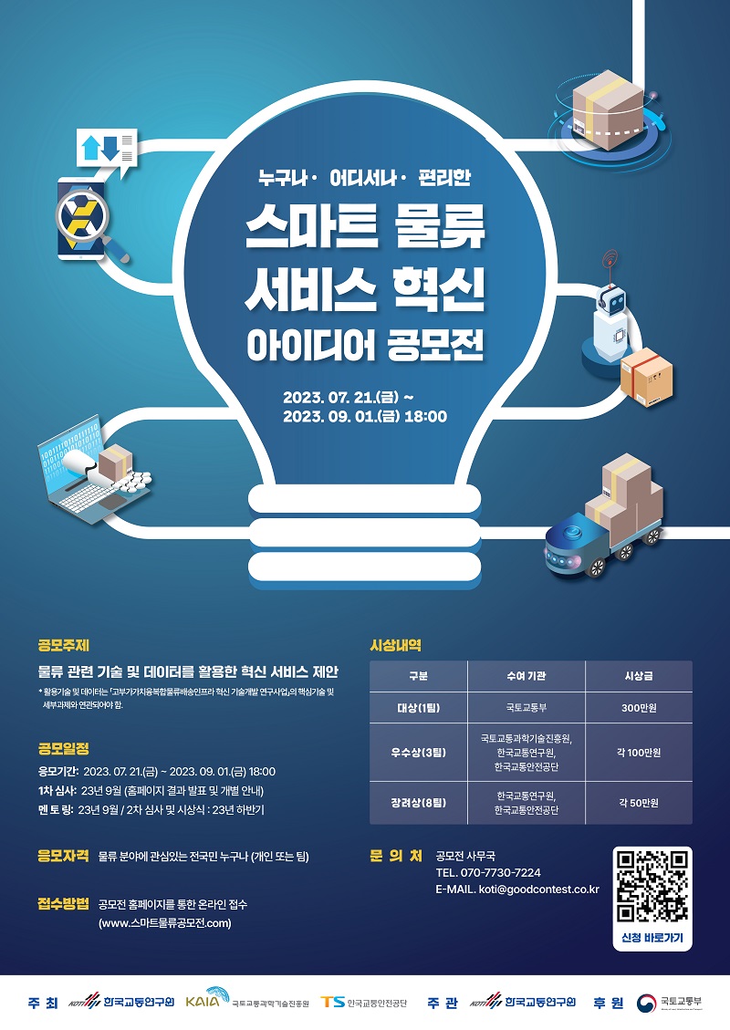 ▣ 수상작 활용 계획 - 제출된 아이디어가 수상작으로 선정될 경우\, 저작권 및 특허출원에 대한 권리 일체는 국토교통과학기술진흥원 융복합물류사업단측에 양도됩니다. ▣ 유의사항 - 공모전 주제는 「고부가가치융복합물류배송인프라 혁신 기술 개발의 7개 핵심기술 및 12개의 세부과제」와 연관 되어있어야 함. 이 외의 서 비스 제안의 경우는 심사에서 제외되며 책임은 공모자에게 있음. - 신청서 및 서류를 누락하거나\, 중요 사항에 대한 오기한 자는 심사에서 제외되며 책임은 공모자에게 있습니다. - 다작 공모가 가능하나 1명(팀) 당 최우수작 1작만 수상 가능합니다. - 수상작에 한하여 원본 제출을 요구할 수 있습니다. - 공모 및 심사 세부일정에 대해서는 공모전 주관기관 사정에 따라 공모자 동의 없이 변경이 될 수 있습니다. - 순수 창작 저작물이어야하며 타 공모전 수상작\, 표절\, 도용\, 복사 등의 경우 심사제외 및 수상취소와 시상내역을 환수할 수 있습니다. - 응모된 제출서류는 일체 반환하지 않으며\, 채택된 아이디어에 대해서 국토교통과학기술진흥원 융복합물류사업단 연구 자료로 활용될 수 있습니다. - 제출된 아이디어가 수상작으로 선정될 경우\, 저작권 및 특허출원에 대한 권리 일체는 국토교통과학기술진흥원 융복합물류사업단측에 양도됩니다. - 최종 수상자의 경우 시상식에 참여해야 합니다. - 제출된 아이디어가 타 공모전 수상작 혹은 표절로 판명되는 경우 입상취소 및 시상금 환수조치 하며\, 지적재산권 등 관련 분쟁시 모든 책임은 응모자에게 있습니다. ▣ 문의처 공모전 운영사무국 ☎ 070-7730-7224 / E-mail koti@goodcontest.co.kr