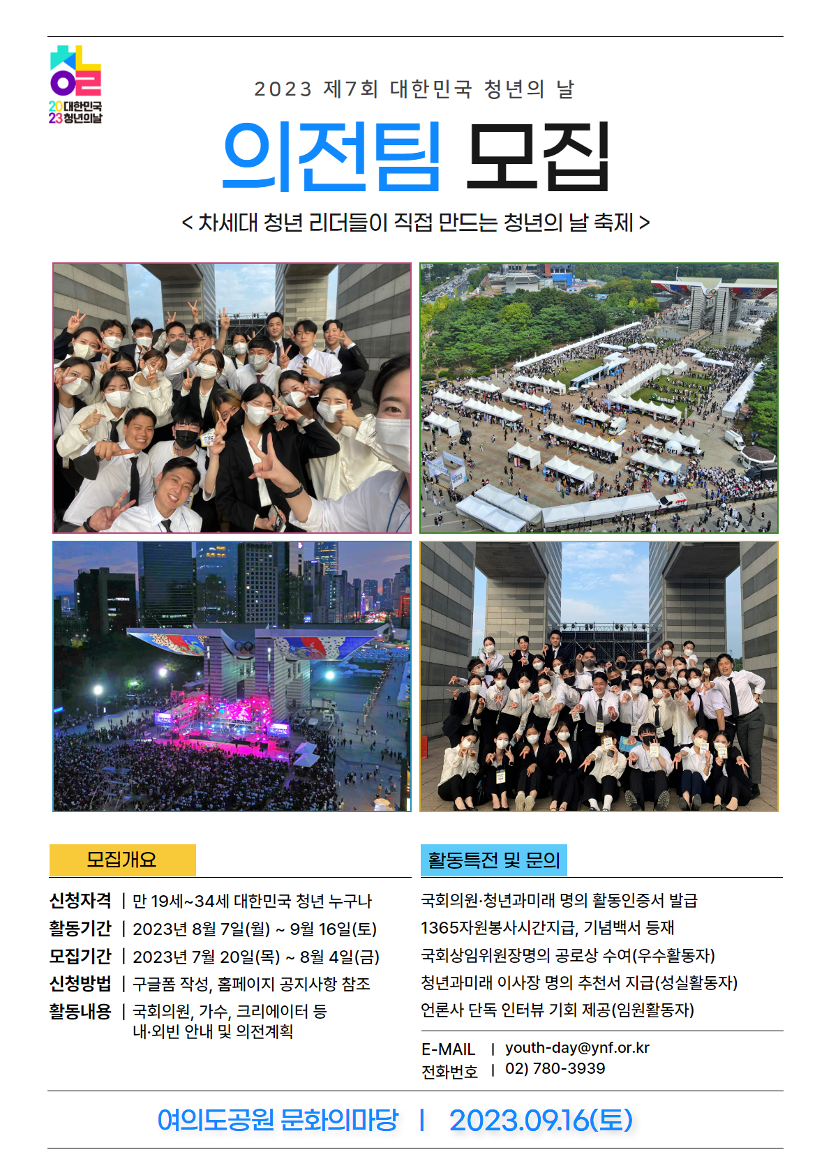 🌼 2023 제7회 대한민국 청년의 날 의전팀 모집 🌼 🔥 내빈 안내는 자신있는 사람 모여라! 🔥 웃으면서 소통만 해도 엄청난 스펙이! 🔥 유명 인사들을 만날 수 있는 기회! 대한민국 청년들이 직접 기획하고 참여하는 참여형 종합축제✨ 이번 청년의 날 내빈 안내해주실 의전팀 여러분을 모집합니다! ☑️ 신청 자격: 만19세 \~ 34세, 대한민국 청년이라면 누구나! ☑️ 행사 일시: 2023년 9월 16일 (토) 여의도공원 문화의 마당 ☑️ 모집 기간: 2023. 07. 20 \~ 2022. 08. 04 ☑️ 활동 기간: 2023. 08. 07 \~ 2023. 09. 16 ☑️ 신청 방법 - https://forms.gle/X58vhZFwWvEbWnY9A - 청년과미래 홈페이지 참고 ☑️ 활동 혜택 - 국회 상임위원장 표창장 (우수활동자) - 국회의원\, 청년과미래 명의 공로상 수여 - 제6회 대한민국 청년의 날 활동인증서 발급 - 1365 자원봉사시간 지급 🌼 제7회 대한민국 청년의 날 의전팀 모집에 지원 바랍니다 🌼