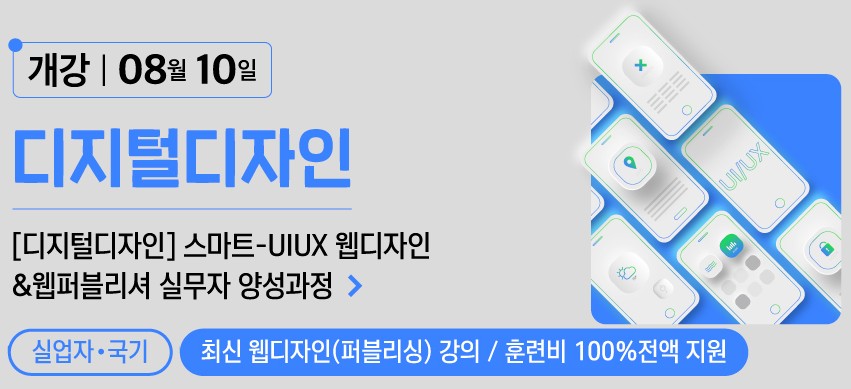 📌 과정안내 ✔ [월\~금] 9:30\~18:30 ✔ 2023.08.10\~2023.12.14 ✔ UI/UX 웹앱 디자인 및 웹 퍼블리셔 과정! ✔ 비전공자도 참여가 가능합니다! ✔ 포트폴리오 : https://url.kr/56dkrj**