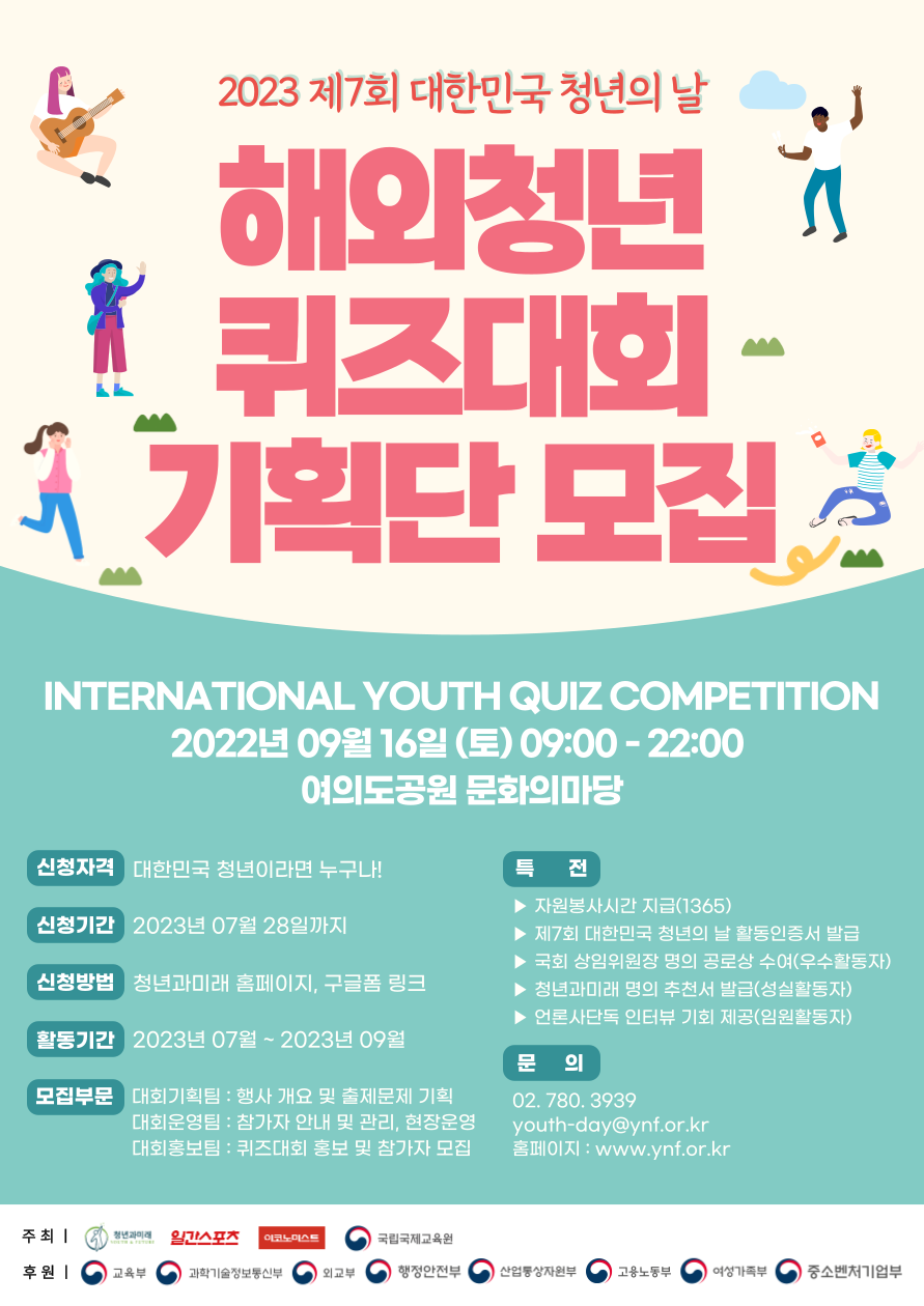 2023 제7회 해외청년퀴즈대회 기획단 모집 <제7회 대한민국 청년의 날> 2023 제6회 해외청년퀴즈대회 기획단을 모집합니다!!