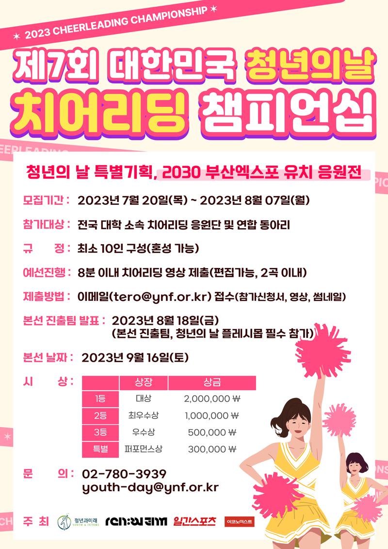 대한민국 청년들이 직접 기획하고 참여하는 참여형 종합축제🔥 이번 청년의 날 함께할 치어리딩팀을 모집합니다! 🌸모집 기간: 2023년 07월 20일 목요일 \~ 2023년 08월 07일 월요일 🌸참가 대상: 전국 대학 소속 치어리딩 응원단 및 연합 동아리 🌸규정: 최소 10인 구성 (혼성 가능) 🌸예선 진행: 8분 이내 치어리딩 영상 제출 (편집가능, 2곡 이내) 🌸제출 방법: 이메일 (tero@ynf.or.kr) 접수 (참가신청서, 영상, 썸네일) 🌸본선 진출팀 발표 - 2023년 08월 18일 금요일 - 본선 진출팀은 2023 대한민국 청년의 날 플래시몹 참가 필수 🌸본선 날짜: 2023년 09월 16일 토요일 🌸시상 - 대상(200만원)\, 최우수상(100만원)\, 우수상(50만원), 퍼포먼스상(30만원) - 본선 진출팀 공로상 발급(PDF) * 2023 대한민국 청년의 날 플래시몹 참가 시 가산점 및 공로상 발급(PDF) 🌸문의 - 02-780-3939 - youth-day@ynf.or.kr