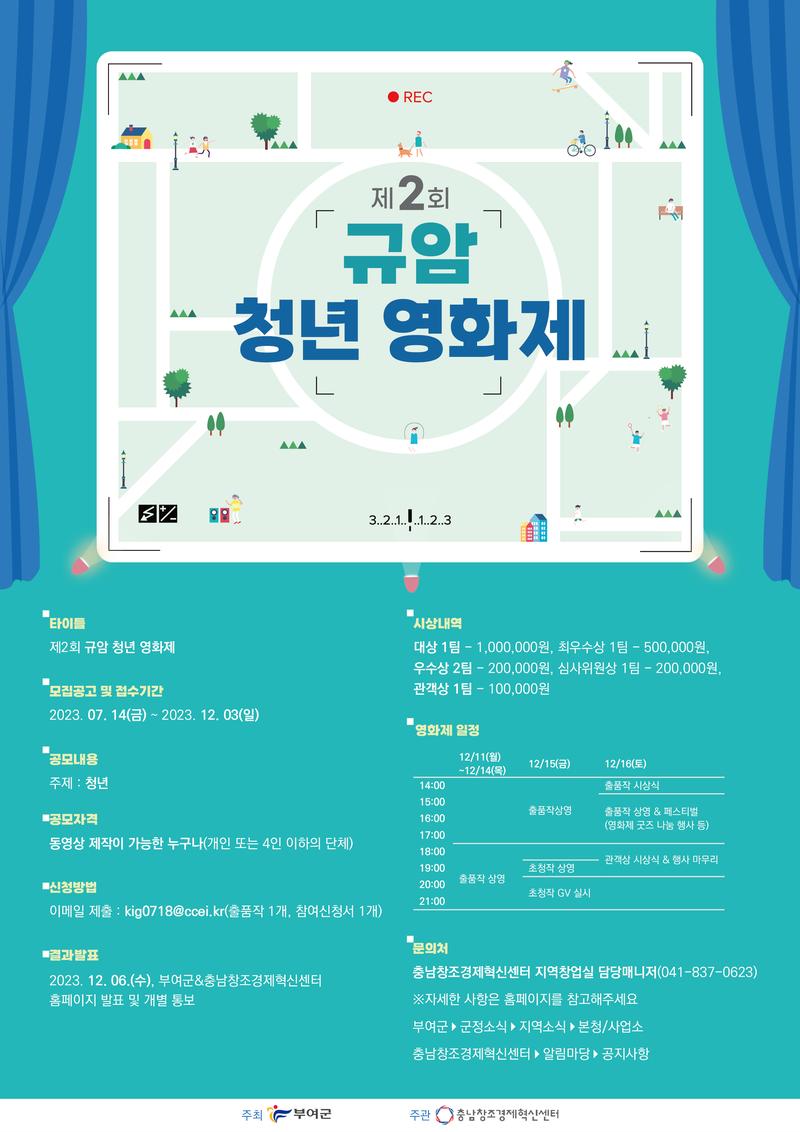 「2023년 제2회 규암 청년 영화제」 모집공고 부여군과 충남창조경제혁신센터에서는 규암 자온길 구도심 활성화 및 시민들의 문화 다양성을 위한 영화제를 실시하고자 다음과 같이 참가 단체를 공개모집 하오니 많은 참여 바랍니다. 2023년 07월 14일 (재)충남창조경제혁신센터장 모집대상 : 동영상 제작이 가능한 대한민국 국민 누구나 ※개인 또는 4인 이하의 팀 출품규격 가. 길이: - 30초 \~ 3분 이하의 극영화 / 다큐멘터리 / 애니메이션 등을 포함한 자유 나. 파일포맷: - 해상도 : 1920X1080(FHD권장) ⎢스마트폰 촬영 응모가능 - 프레임 : 23.97fps 이상 - 포맷 : mp4(권장). mov, avi, mpeg, wmv 등 표준 코덱 형식 1. 추진개요 가. 추 진 명: 2023년 제2회 규암 청년 영화제 나. 공고 및 접수기간 / 시상식 - 공고 및 접수기간: 2023. 07.14.(금) \~ 2022.12. 03.(일) (18:00까지) - 심사실시 : 2023.12.05.(화)\, 전문가를 위촉하여 모집된 영상물 평가 실시 - 결과발표 : 2022. 12.06(수)\, 선별된 출품작 30作 개별통보 및 홈페이지 공지 - 시상식 : 2023. 12.16.(토) / 부여 청년창고(충남 부여군 규암면 수북로33) 다. 공모주제: 청년 라. 공모내용 - 청년에 관한 다양한 이야기를 담은 자유주제 대상 1팀 × 1,000,000원, 최우수상 1팀 × 500,000원, 우수상 2팀 × 200,000원, 심사위원상 1팀 × 200,000원, 관객상 1팀 × 100,000원 - 행사 당일\, 상장(상패\, 트로피 등) 전달 *수상자 시상식 필참, 불참 시 수상불가 - 상금은 개인(팀)에게 제세공과금을 제외한 금액을 계좌로 입금 - 관객상은 행사 기간 내 방문객들 대상으로 인기투표를 실시하여 선별 및 수상 예정 - 입상자는 상패 없이\, 상장 배부 예정 신청방법: 출품자 개인 구글 드라이브 영상 업로드 후 URL주소 기입 가. kig0718@ccei.kr 메일로 URL 및 영상 파일 제출 나. 이메일 송부 시 메일 제목 : (2023 규암 청년 영화제 참여 신청) 팀명 or 대표자명 명시 다. 참여 신청서 제출 시 서명/직인 날인 및 PDF파일 제출 라. 문의처 : 충남창조경제혁신센터 ☎041-837-0623