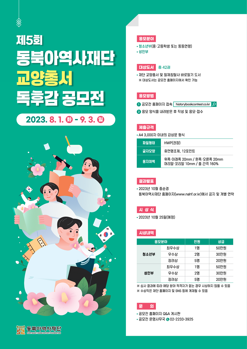 응모주제 - 대상 도서(교양총서 및 일제침탈사 바로알기) 독후감 공모 응모분야 - 청소년부(중·고등학생 또는 동등연령) - 성인부 접수방법 응모 양식에 작성 후 공모전 홈페이지를 통한 온라인 접수(http://www.historybookcontest.co.kr/) - 응모양식 위치: 공모전 홈페이지 공지사항 제출규격 A4 3,000자 이내의 감상문 형식