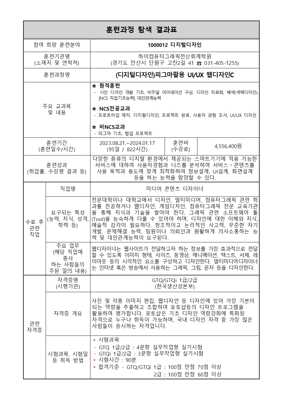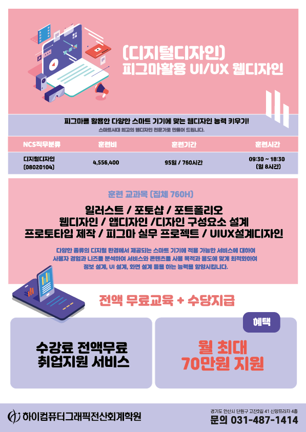 ○ 2022년 직업능력개발훈련 심사평가(인증+과정) : 5년인증(우수)훈련기관 ○ 수강료 : 4,556,400원(전액 국비지원)❗❗ ✓ 비전공자/초보자 중심 맞춤형 교육 ✓ 온/오프라인 교육콘텐츠 제공 📞 전화문의 : 031-487-1414 💁 카톡문의 : https://open.kakao.com/o/sf4SYLUe 🔗 온라인문의 : https://ansan.himedia.co.kr/Counsel/online ○ 훈련목표 - 다양한 종류의 디지털 환경에서 제공되는 스마트기기에 적용 가능한 서비스에 대하여 사용자경험과 니즈를 분석하여 서비스ㆍ콘텐츠를 사용 목적과 용도에 맞게 최적화하여 정보설계, UI설계, 화면설계 등을 하는 능력을 함양할 수 있습니다. ○ 훈련교재(무상제공) - 디지털디자인 학습모듈_수정보완 - 서비스·경험디자인 학습모듈_서비스·경험디자인 사용자 경험 조사 - 서비스·경험디자인 학습모듈_서비스·경험디자인 프로토타입 제작 - 디지털디자인 학습모듈_디지털디자인 구성요소설계 - 디지털디자인 학습모듈_프로토타입 설계 제작 및 사용성 테스트 - 디지털디자인 학습모듈_디지털디자인 프로젝트 설계 - 디지털디자인 학습모듈_디자인 구성요소 제작 - 디지털디자인 학습모듈_디지털디자인 구성요소 응용 - 디지털디자인 학습모듈_디지털디자인 사후관리 - 디지털디자인 학습모듈_프로젝트 완료 보고 - 스마트문화앱콘텐츠제작 학습모듈_스마트문화앱 UX 설계 - 스마트문화앱콘텐츠제작 학습모듈_스마트문화앱 UI 디자인 - 처음 만나는 피그마(설계부터 협업까지 올인원 UX/UI 제작 툴)