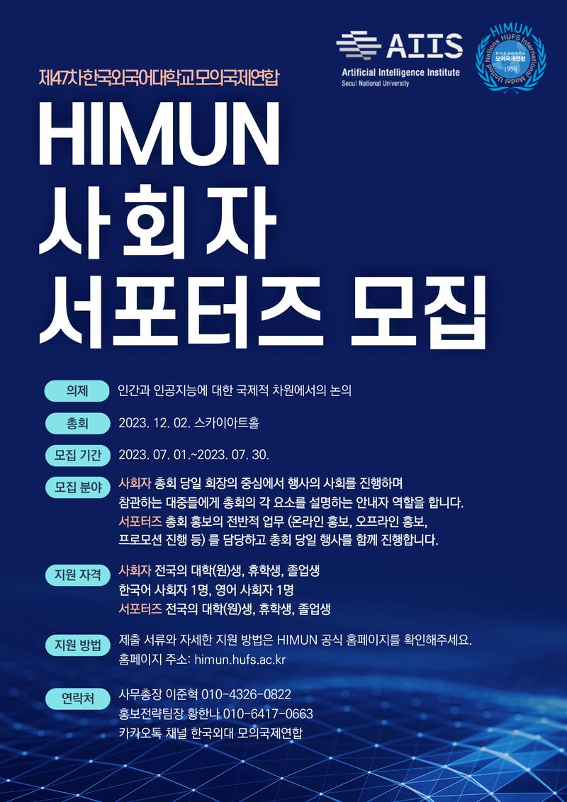 🇺🇳한국외대 모의국제연합 \| 제47차 HIMUN 사회자·서포터즈 모집🇺🇳 제47차 HIMUN 사회자 및 서포터즈 지원서 접수를 시작합니다‼️ 🗣[사회자] 총회 당일 회장의 중심에서 행사의 사회를 진행하며, 참관하는 대중들에게 총회의 각 요소를 설명하는 안내자 역할을 합니다! 👥[서포터즈] 총회 홍보의 전반적인 업무 (온/오프라인 홍보 활동, 프로모션, 영상 제작 등) 를 담당하고 총회 당일 행사를 함께 진행합니다! 🤍모집기간: 2023년 7월 1일-2023년 7월 30일 자정 마감 총회일시: 2023년 12월 2일(토) 총회장소: 스카이아트홀 지원자격: 열정 가득한 대학(원)생, 휴학생, 졸업생 지원방법: 제출 서류와 자세한 지원 방법은 HIMUN 공식 홈페이지(himun.hufs.ac.kr)에 방문하여 확인해주세요! 📞문의 🗣사회자: 사무총장 (010-4326-0822) 👥서포터즈: 홍보전략팀장 (010-6417-0663) 💬카카오톡 채널 ‘한국외대 모의국제연합’ 이번 2023년 HIMUN 모의유엔총회 의제는 "인간과 인공지능에 대한 국제적 차원에서의 논의"입니다. 2023년 다가오는 겨울, 국내 최고(最古), 최대 규모의 MUN을 빛낼 사회자와 서포터즈로 활동하며 좋은 경험을 할 수 있는 절호의 기회입니다! JOIN HIMUN💙