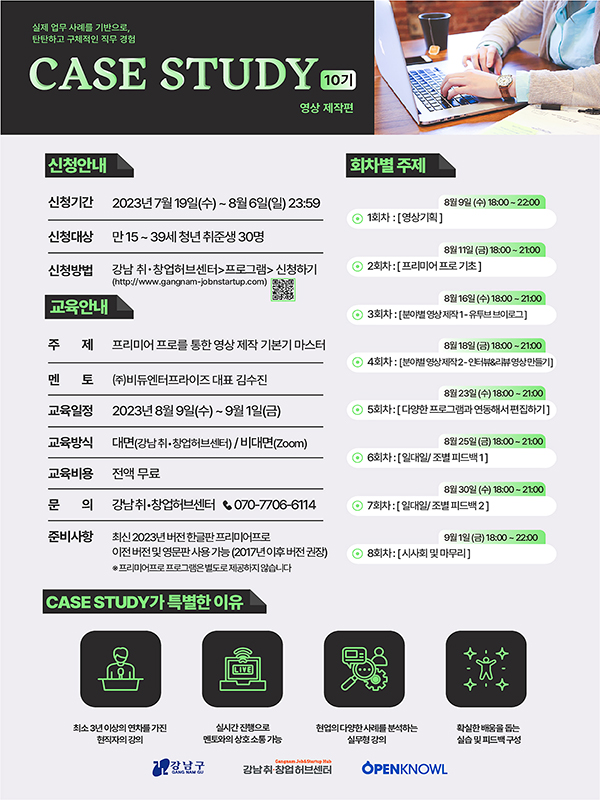 [교육 안내] 🟧 주 제 : 프리미어 프로를 통한 영상 제작 기본기 마스터 🟧 멘 토 : (주)비듀엔터프라이즈 대표 김수진 🟧 교육일시 : 2023년 8월 9일(수) \~ 9월 1일(금) 🟧 교육대상 : 만 15세\~39세 청년 취준생 30명 🟧 교육장소 : 대면(강남 취•창업허브센터)/비대면(ZOOM) 🟧 교육내용 : 🟠 8월 9일(수) 18:00\~22:00 1회차 영상기획 🟠 8월 11일(금) 18:00\~21:00 2회차 프리미어 프로 기초 🟠 8월 16일(수) 18:00\~21:00 3회차 분야별 영상 제작 1 - 유튜브 브이로그 🟠 8월 18일(금) 18:00\~21:00 4회차 분야별 영상 제작 2 - 인터뷰&리뷰 영상 만들기 🟠 8월 23일(수) 18:00\~21:00 5회차 다양한 프로그램과 연동해서 편집하기 🟠 8월 25일(금) 18:00\~21:00 6회차 일대일/조별 피드백 1 🟠 8월 30일(수) 18:00\~21:00 7회차 일대일/조별 피드백 2 🟠 9월 1일(금) 18:00\~22:00 8회차 시사회 및 마무리 🟧 교육비용 : 전액 무료 (정가 20만원) 🟧 준비사항 : 최신 2023년 버전 한글판 프리미어프로 이전 버전 및 영문판 사용 가능 (2017년 이후 버전 권장) ※ 프리미어프로 프로그램은 별도로 제공하지 않습니다 [신청안내] 🟧 신청기간 : 2023.07.19.(수) \~ 08.06.(일) 23:59 🟧 신청방법 : 강남 취•창업허브센터 (http://www.gangnam-jobnstartup.com) > 프로그램 > 신청하기 ※ 자세한 내용은 홈페이지를 통해 확인 바랍니다.