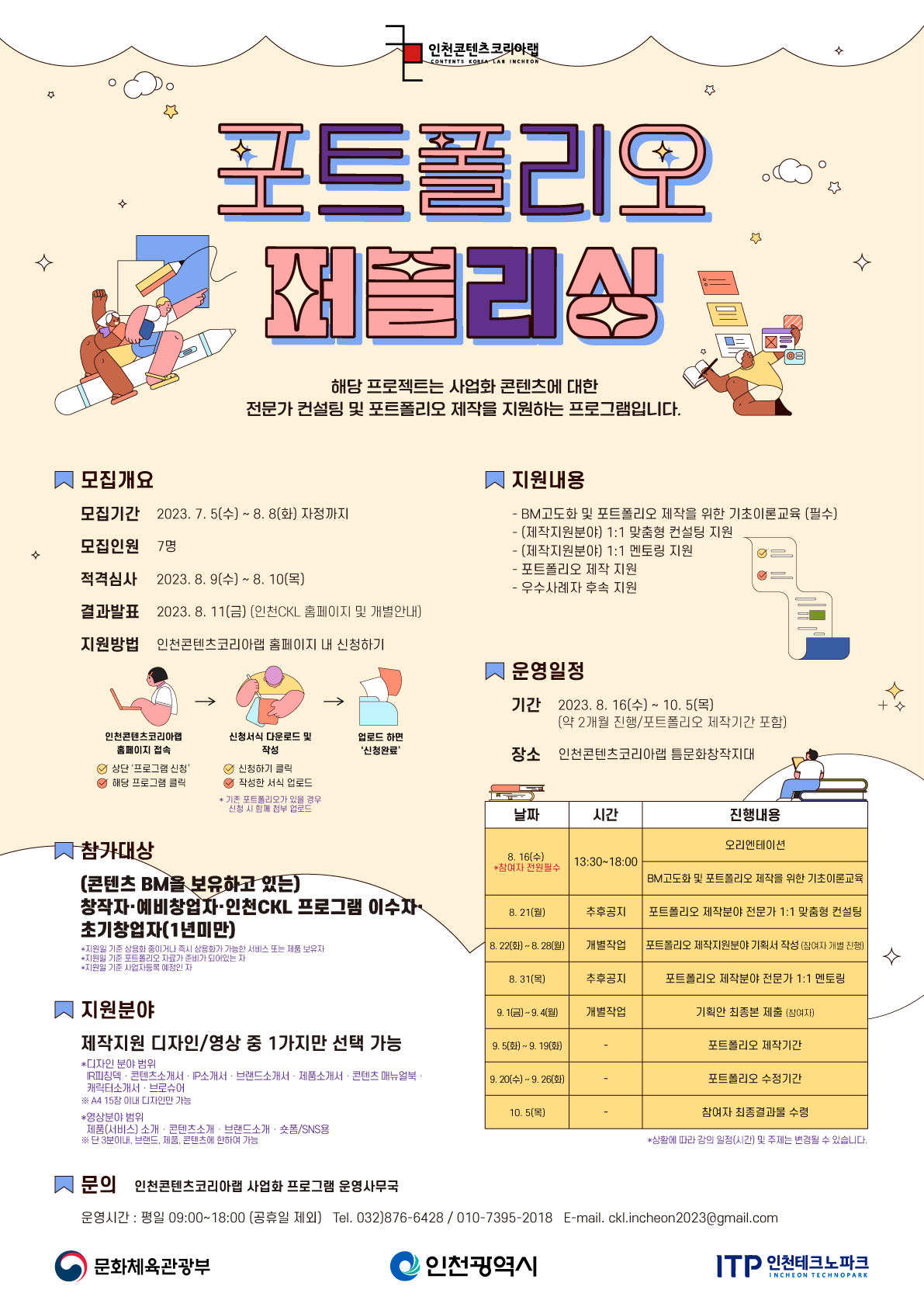■ 지원내용 - BM고도화 및 포트폴리오 제작을 위한 기초 이론교육 ★필수★ → 8. 16(수) 13:30\~18:00** - (제작지원분야) 1:1 맞춤형 컨설팅 지원 - (제작지원분야) 1:1 멘토링 지원 - 포트폴리오 제작 지원 - 우수사례자 후속 지원 ☎️문의 : 인천콘텐츠코리아랩 사업화 프로그램 운영사무국 Tel) 032-876-6428 E-mail) ckl.incheon2023@gmail.com