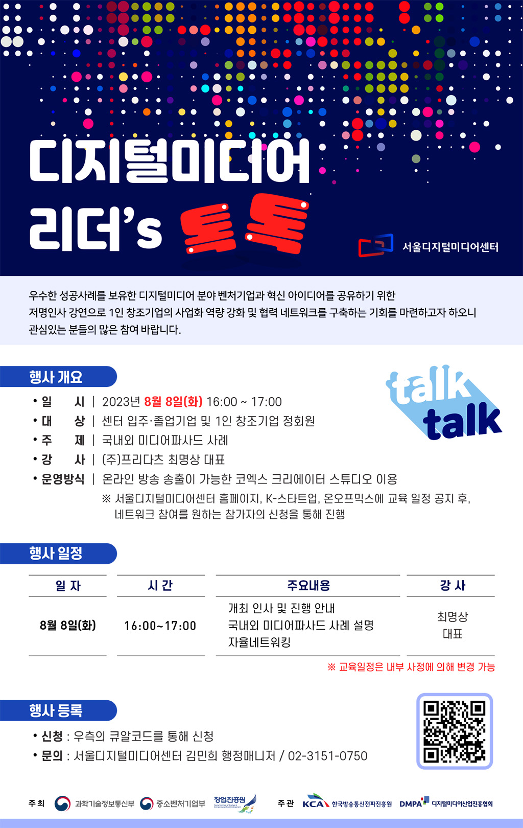 서울디지털미디어센터는 디지털미디어 분야 특화센터로, 디지털미디어 관련 창업·벤처 기업의 창의적 아이디어 사업화를 지원하고 있습니다. 이번 진행되는 네트워킹 프로그램은 우수한 성공사례를 보유한 디지털미디어 분야 벤처기업과 혁신 아이디어를 공유하기 위한 저명인사 강연으로 1인 창조기업의 사업화 역량 강화 및 협력 네트워크를 구축하는 기회로 활용하고자 합니다.