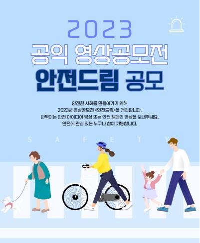 ◈공모전명 2023 공익 영상공모전 <안전드림> "안전한 사회를 만들어가기 위해 2023년 영상공모전 <안전드림>을 개최합니다. 반짝이는 안전 아이디어 영상 또는 안전 캠페인 영상을 보내주세요! 안전에 관심 있는 누구나 참여 가능합니다" 주최: 방송콘텐츠진흥재단 후원: 공영홈쇼핑 ◈온라인접수 https://bcpf.or.kr/site/bbsnotice/view?id=2529 ◈접수기간 2023년 6월 26일 (월) \~ 8월 31일 (목) 16:00까지 ◈선정작 발표 2023년 9월 25일 (월) 예정 ◈시상식 2023년 10월 26일 (목) ◈공모목적 안전의식을 개선하고, 안전한 사회를 만들어나가고자 안전 아이디어 및 캠페인 영상공모전 개최 ◈공모대상 - 영상제작에 관심 있는 대한민국 국적의 누구나 (만 19세 이상) - 개인 또는 팀 (단, 팀의 경우 4인 이하로 구성) ◈공모주제 안전과 관련된 자유주제 제작분량 - 1분 \~ 3분 이내 영상 - 콘텐츠 업로드 시 개인/팀 유튜브 또는 인스타그램에 해시태그 필수 입력 (#안전드림 #BCPF #공영홈쇼핑) ◈시상내역 - 대상(1편): 7백만원 - 최우수상(2편): 5백만원 - 우수상(4편): 3백만원 - 특별상(5편): 2백만원 ◈문의 콘텐츠사업팀 T. 02-6123-4300