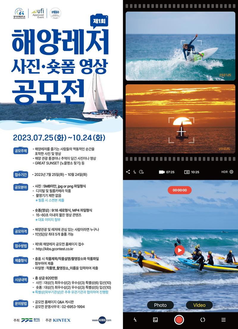 ◦ 제1회 해양레저 공모전 홈페이지 접수 http://kibs.gcontest.co.kr ◈ 작품제출 형식 ◦사진 (5M 미만, 파일형식 jpg or png 파일) ※필름 시 스캔 본 제출 ◦숏폼 영상 (15초\~60초 이내의 영상, 9:16 세로형식, 파일형식 MP4) ※숏폼 영상은 대표이미지 첨부 ◦출품 시 작품제목/작품설명/촬영장소 입력, 작품파일은 첨부하여 제출 ◦파일명에는 작품명_촬영장소_이름 입력 ◈ 시상내역 ◦총 상금 920만원 ◦사진부문 대상(1인) 100만원 경기도지사 상 /최우수상 (2인) 각 50만원/ 우수상(3인) 각 30만원 SUNSET 특별상 (6인) 5만원 모바일상품권 / 입선(10인) 소정의 상품 ※최우수상 외 특별상(외부기관상)은 추후 유관기관과 협의하여 진행함