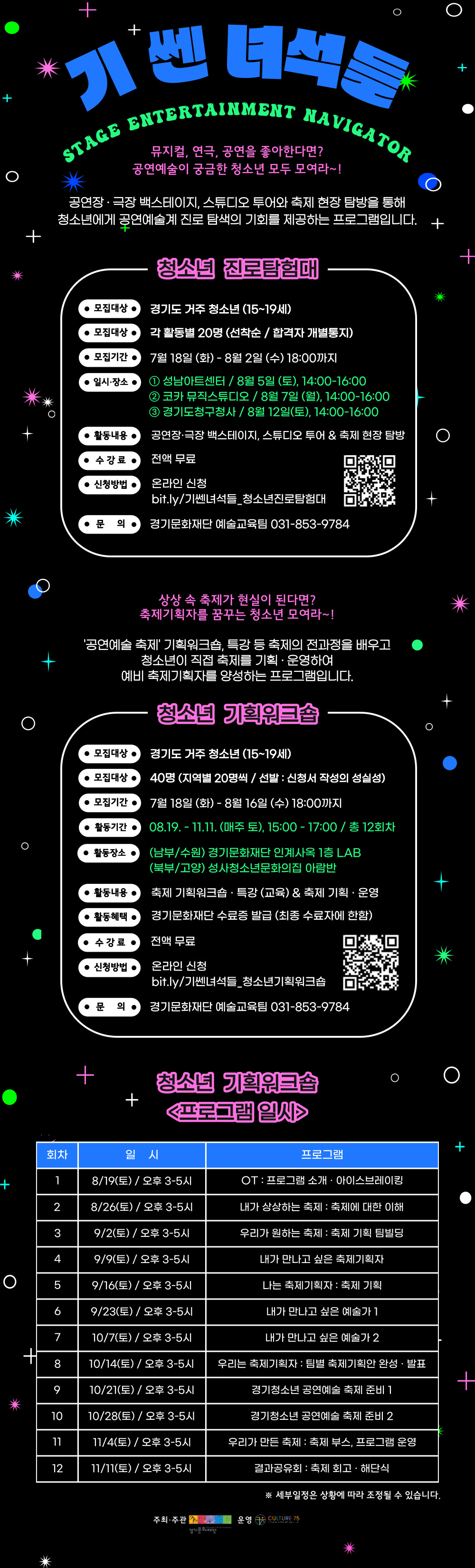 ■ 활동명 : 청소년 기획워크숍 ■ 지원 자격 : 경기도 거주 청소년(15 \~ 19세) ■ 모집 기간 : 2023.07.18(화) \~ 08.16(수) 18:00까지 ■ 활동 내용 : '공연예술 축제'기획워크숍,특강 등 축제 교육 및 축제 기획, 운영 ■ 활동 일시 : 08.19. - 11.11.(매주 토), 15:00 - 17:00 /총12회차 ■ 활동 장소 ① (남부/수원)경기문화재단 인계사옥1층LAB ② (북부/고양)성사청소년문화의집 아람반 ■수강료 : 전액 무료 ■ 지원 방법 : (온라인 신청)http://bit.ly/기쎈녀석들_청소년기획워크숍 ■ 문의 사항 : 경기문화재단 예술교육팀031-853-9784