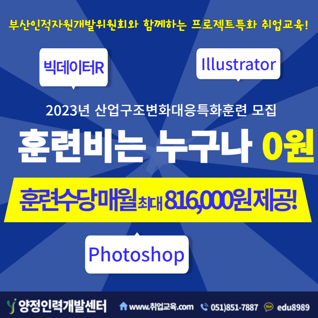 ⚡[웹디자인/웹퍼블리싱 취업반] 빅데이터 분석 & 시각화 UI콘텐츠 개발 모집【🔥선착순 모집마감】 웹디자인/웹퍼블리싱 취업 희망자 모두 모여라!!! (비전공자도 환영👌) 📣2023년도 하반기 웹디자인/웹퍼블리싱 취업반 오프라인교육 오픈 💻IT 취업핵심인 프로그래밍언어(JAVA, Python, R 등)로 프로젝트까지 완성 갓생사는 취준생&졸업예정자&졸업자 적극 추천합니다. [웹디자인/웹퍼블리싱 취업반 주요일정] ✔️교육명 : 빅데이터 분석 & 시각화 UI콘텐츠 개발 ✔️교육기간 : 08월 23일 \~2024년 01월 25일 ✔️교육시간 : 평일 8교시(09:00\~17:30) ✔️교육장소 : 고용노동부 지정 우수훈련기관 양정인력개발센터 * 부산에서 오프라인(대면)수업으로 진행되니 참고해주세요. 💥여기서 잠깐!! STOP!! 💛참여혜택💛부터 확인해보면 참여안할 수가 없을걸\~\~? [웹디자인/웹퍼블리싱 취업반 참여 시 혜택] 💲 교육비 전액 100%국비지원 💎 매월 교육 장려금 제공(국민취업지원제도 연계 가능) - 국민취업지원제도1 : 816,000원 - 국민취업지원제도2 : 600,000원 - 국민내일배움카드 : 316,000원 📚 교재 무상 제공(12만원 상당) 🖥️ 웹디자인/웹퍼블리싱 취업대비 포트폴리오 완성 -웹디자인/웹퍼블리싱 취업반 수료생의 포트폴리오 보러가기>> [웹디자인/웹퍼블리싱 취업반 교육대상] 💳 국민내일배움카드 신청 가능자 * 국비무료교육 참여 이력이 있어도 한번 더 전액무료! 📖 미취업상태의 취업준비생 * 관련분야의 전공자가 아니라도 참여 가능합니다. 📝 수업시간에 성실히 참여할 수 있는 대학생 * 재학생일 경우 : 4학년 졸업예정자 또는 기졸업자 * 휴학생일 경우 : 3학년 이상일 경우 참여 가능함. 📜 교육기간동안 성실히 참여가능한 분 * 부산에서 진행하는 대면교육인 점 참조 부탁드립니다. 🔰산업체 실무 프로젝트 완성까지 할 수 있는 탄탄한 커리큘럼은 필수!! • 교육과정 커리큘럼