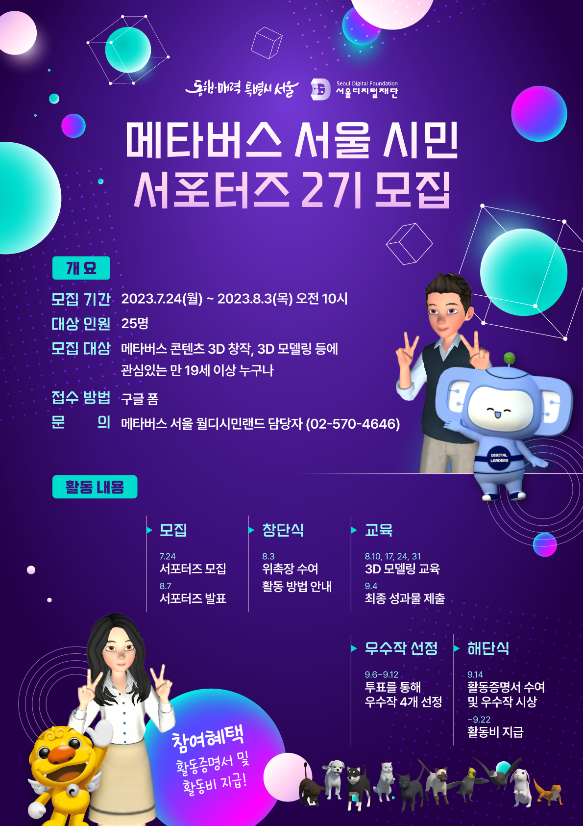 서울디지털재단에서 ‘메타버스 서울 시민 서포터즈’를 모집합니다. 3D 모델링 교육에 참여해 시민이 직접 3D 모델을 창작합니다. 우수작을 선발해 『메타버스 서울』을 구성하는 오브젝트로 탑재해 시민들에게 선보일 수 있는 기회를 제공합니다. 관심 있는 분들의 많은 참여 바랍니다. 2023년 7월 24일 재단법인 서울디지털재단 이사장 건명: 메타버스 서울 시민 서포터즈 2기 모집 기간: 2023.7.24.(월) 오전 10시\~2023.8.3.(목) 오전 10시 모집 인원: 25명 모집 대상: 메타버스 콘텐츠 창작, 3D 모델링 등에 관심있는 만 19세 이상 누구나 신청 자격 ㅇ 『메타버스 서울』 app을 다운로드하고 가입한자 ㅇ 메타버스, 3d 모델링에 대한 이해도와 활동의지가 높은 자 ㅇ 창단식, 교육 4회, 해단식에 필수 참석이 가능한자 활동 기간 ㅇ 창단식: 2023.8.10.(목) 예정 ㅇ 교육(4회): 2023.8.10.(목), 2023.8.17.(목), 2023.8.24.(목), 2023.8.31.(목) ㅇ 해단식: 2023.9.14.(목) 예정 ※ 해단식은 오프라인(장소: 서울스마트시티센터, 시간: 미정) 개최 예정 활동 내용 ㅇ 창작 주제: 미정(창단식에서 안내 예정) ※ (예시) 메타버스 서울 미술관 ㅇ 창작 목적: 메타버스 서울 월디시민랜드에 시민 창작 3d 모델링 탑재 ※ 우수작을 선정해 메타버스 서울에 실제 구현할 미술관 건물 모델링 탑재 ㅇ 창작 규격