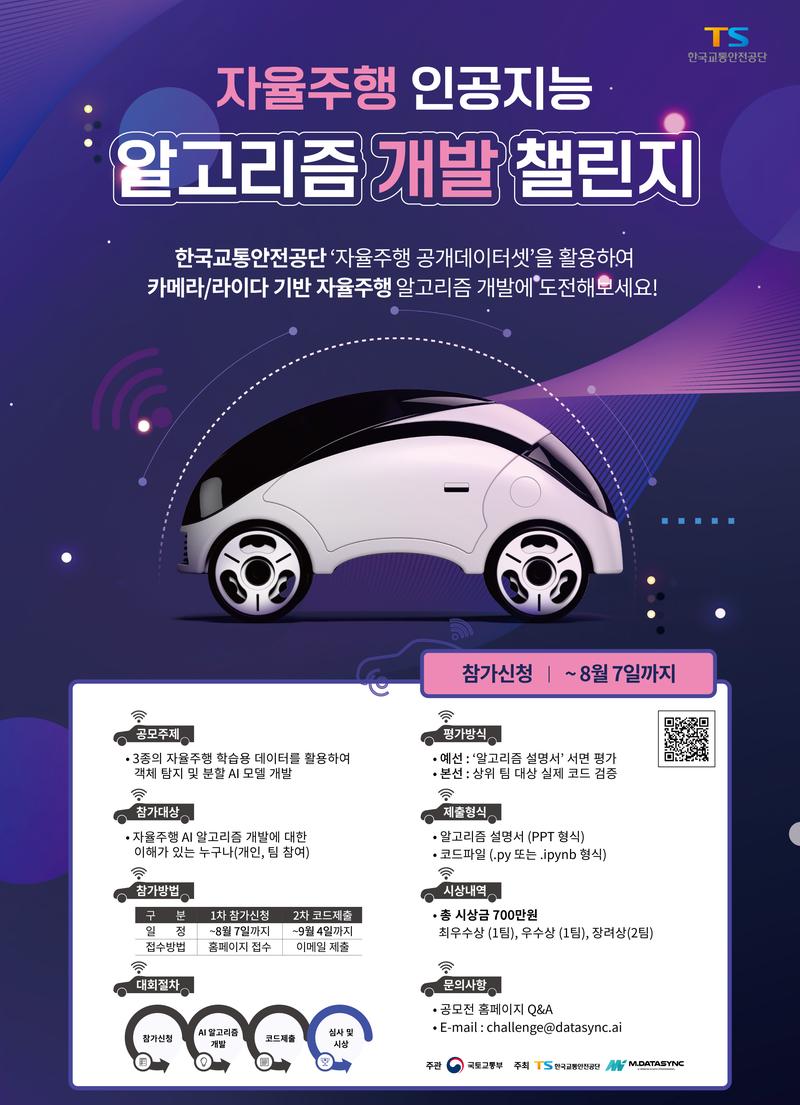 자율주행 인공지능 알고리즘 개발 챌린지 한국교통안전공단 ‘자율주행 공개데이터셋’을 활용하여 카메라/라이다 기반 자율주행 알고리즘 개발에 도전해보세요! ◈ 대회주제 ◦3종의 자율주행 학습용 데이터를 활용하여 객체 탐지 및 분할 AI 모델 개발 ◈ 참가대상 ◦자율주행 AI 알고리즘 개발에 대한 이해가 있는 누구나 개인 또는 팀을 구성하여 참가 가능 ※동일인이 개인 또는 복수의 팀으로 중복 신청 불가) ◈ 참가신청 기간 ◦ 2023년 7월 25일(화) \~ 8월 7(월)일 23:59 까지 ◈ 참가방법 ◦ 1차 참가신청 7월25일 \~8월 7일 까지 / 홈페이지를 통해 접수 ◦ 2차 코드제출 9월 4일 까지 /이메일 제출 ◈ 대회절차 ◦ 참가신청 ▶ AI 알고리즘 개발 ▶ 코드제출 ▶ 심사 및 시상 ◈ 평가방식 ◦ 예선 : '알고리즘 설명서' 서면평가 ◦ 본선 : 상위 팀 대상 실제 코드 검증 ◈ 제출형식 ◦개발한 AI 모델에 대한 '알고리즘 설명서' PPT 문서 작성 ◦코드파일 (. py 또는 .ipynb 형식) ※ 자세한 내용은 ‘상세안내’ 페이지 참조 ◈ 시상 내용 ◦최우수상 1팀 (300만원) 우수상 1팀 (200만원) 장려상 2팀 (100만원) ◈ 문의사항 ◦ 문의처 : 공모전 홈페이지 Q&A / e-mail : challenge@datasync.ai ◦ 070-8806-9204