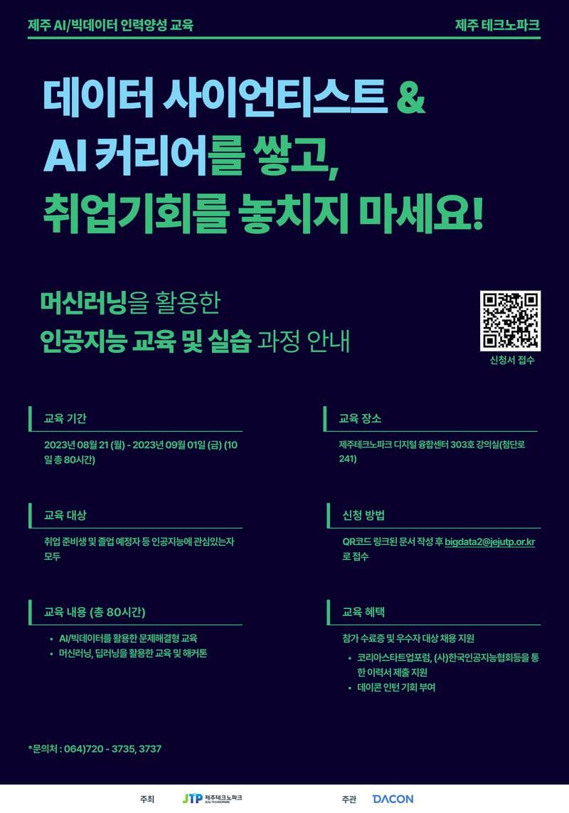 ○교육내용(총 80시간) -AI/빅데이터를 활용한 문제해결형 교육 -딥러닝 입문 강의(제주도 특화 산업 또는 특산물 데이터 활용) -딥러닝 입문 강의 관련 실습 혹은 해커톤