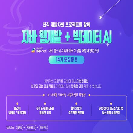 [에이콘아카데미] 훈련과정 : [K-Digital] 현직 개발자와 함께하는 JAVA기반 풀스텍 웹 개발자 & 빅데이터 AI 과정 훈련자격 : 전공무관. 취업준비생.졸업예정자.취업성공패키지참여자.재학생(방통대,야간대) 교육일정 : 2023. 08. 30 \~ 2024. 02. 22 (5.5개월) 교육시간 : 09:00 \~ 18:00(주5일수업. 일일8시간. 5.5개월 / 115일_총920시간) 교육지점 : 에이콘아카데미 홍대지점 교육비용 : K-Digital 전액국비지원(국가기간.전략산업훈련 취업과정) 훈련수당 : 매월 316,000원 + 추가수당 284,000 \~ 500,000원 지급 교육문의 : 02-703-0156 / ocm7607@naver.com**