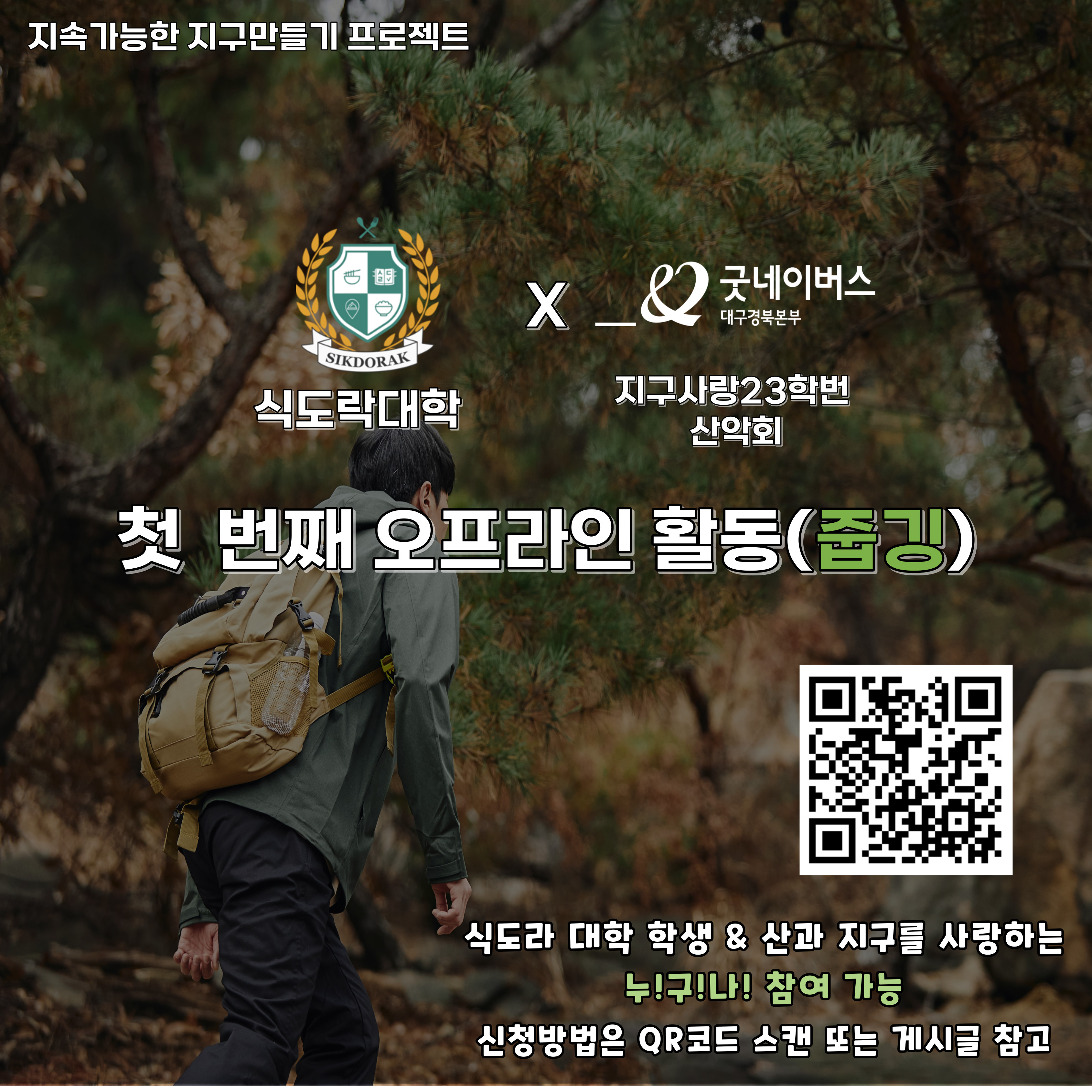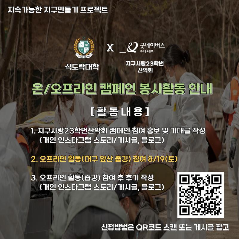 식도락대학과 지구사랑23학번산악회가 함께하는 첫 번째 온/오프라인 캠페인 봉사활동입니다. 본 봉사활동은 굿네이버스 대구경북본부와 식도락 대학과의 협업하여 지구사랑 23학번 산악회 활동(일상생활&등산 속 환경보호 활동 등)을 포함한 비영리 단체(NGO)기관의 봉사활동 기회 제공을 통해 사회적 나눔의 가치와 중요성에 대한 체험 기회를 제공하기 위해 기획되었습니다. <지구사랑23학번산악회 온/오프라인 캠페인 봉사활동> 1) 지구사랑23학번산악회 캠페인 참여 홍보 및 기대글 작성 *개인 SNS 업로드(인스타그램, 블로그) 2) 오프라인활동 대구 앞산 줍깅(8월 19일 예정) 참여 *줍깅 완료 후 저녁식사 겸 활동소감 공유회 예정(자부담 1만원) 3) 오프라인활동(줍깅) 참여 후 후기 작성 ⚑신청방법 : 구글폼 https://forms.gle/ByYGnAxgRU1F7kSS9 *신청자 대상 오픈채팅방 개설하여 세부진행방법 안내 예정 등산&봉사활동을 좋아하는 사람은 누구나!!! 지원 가능합니다!!! ⚑봉사활동 문의 : 굿네이버스 대구경북본부 최미선 대리 053-951-1391 / 인스타그램 @_misun95
