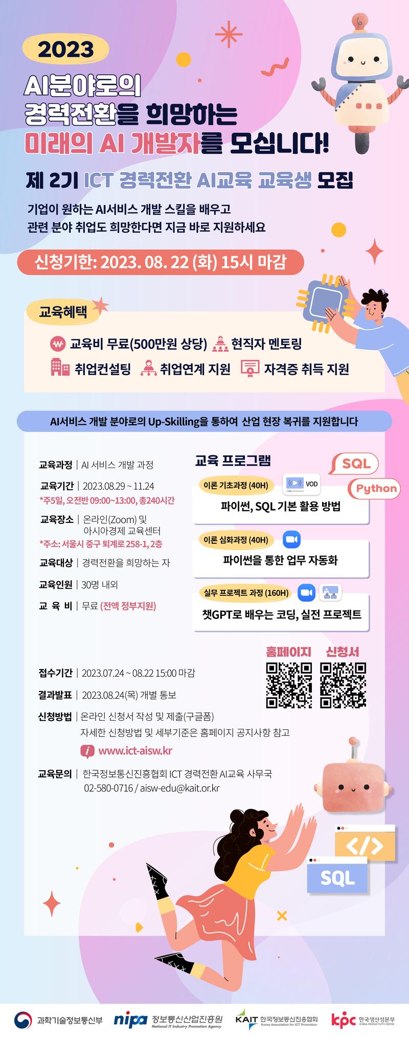 ● 문의 한국정보통신진흥협회 ICT 경력전환 AI교육 사무국 aisw-edu@kait.or.kr / 02-580-0716