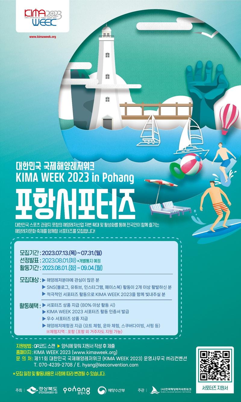 ○ 행사개요 ⏵ 행사명 - 제11회 대한민국 국제해양레저위크 (KIMA WEEK 2023) ⏵ 장소 - 포항 월포, 용한리 해수욕장 / 흥해, 구룡포, 호미곶 등 다이빙 포인트 ⏵ 주제 - 대한민국 스포츠 관광지 포항의 해양레저산업 저변 확대 및 활성화를 통해 전 국민이 함께 즐기는 해양레저문화 축제 ⏵ 주최/주관 - 해양수산부, 경상북도, 부산광역시, 포항시 / (사)한국해양레저네트워크 ○ 모집개요 ⏵ 모집대상 (50명) - 해양레저분야에 관심이 많은 분 - SNS(블로그, 유튜브, 인스타그램, 페이스북 등) 활동이 2개 이상 활발하신 분 - 적극적인 서포터즈 활동으로 KIMA WEEK 2023을 함께 빛내주실 분 ⏵ 모집기간 - 2023.07.13.(목) \~ 2023.07.31.(월) 23:59까지 ⏵ 선정발표 (*개별 통지 예정) - 2023.08.01.(화) ○ 활동개요 ⏵ 활동기간 - 2023.08.01.(화) \~ 2023.09.04.(월) ⏵ 활동내용 - 홍보 콘텐츠 제작 및 개인 SNS로 확산 (카드뉴스, 포스트, 영상 제작 등) - KIMA WEEK 해양레저체험 참여 후 후기 작성 ※ 해양레저체험 불가능자도 지원 가능 ⏵ 활동혜택 - 서포터즈 상품 지급 (80% 이상 활동 시) - KIMA WEEK 2023 서포터즈 활동 인증서 발급 - 우수 서포터즈 상품 지급 - 해양레저체험권 지급 (요트 체험, 운하 체험, 스쿠버다이빙, 서핑 등) ※ 체험지역 : 포항 (포항 외 거주자도 지원 가능) ○ 접수방법 - 아래 양식에 맞춰 지원서 작성 후 제출 https://naver.me/G6yOmDk6 ○ 홈페이지 - 대한민국 국제해양레저위크 KIMA WEEK 2023 (http://www.kimaweek.org) ○ 문의처 - 제11회 대한민국 국제해양레저위크 (KIMA WEEK 2023) 운영사무국 T. 070-4239-2708 E. hyang@leeconvention.com ※ 모집일정 및 활동내용은 사무국 상황에 따라 변경될 수 있습니다. ※ 서포터즈 활동기간 동안 게시물 삭제 불가