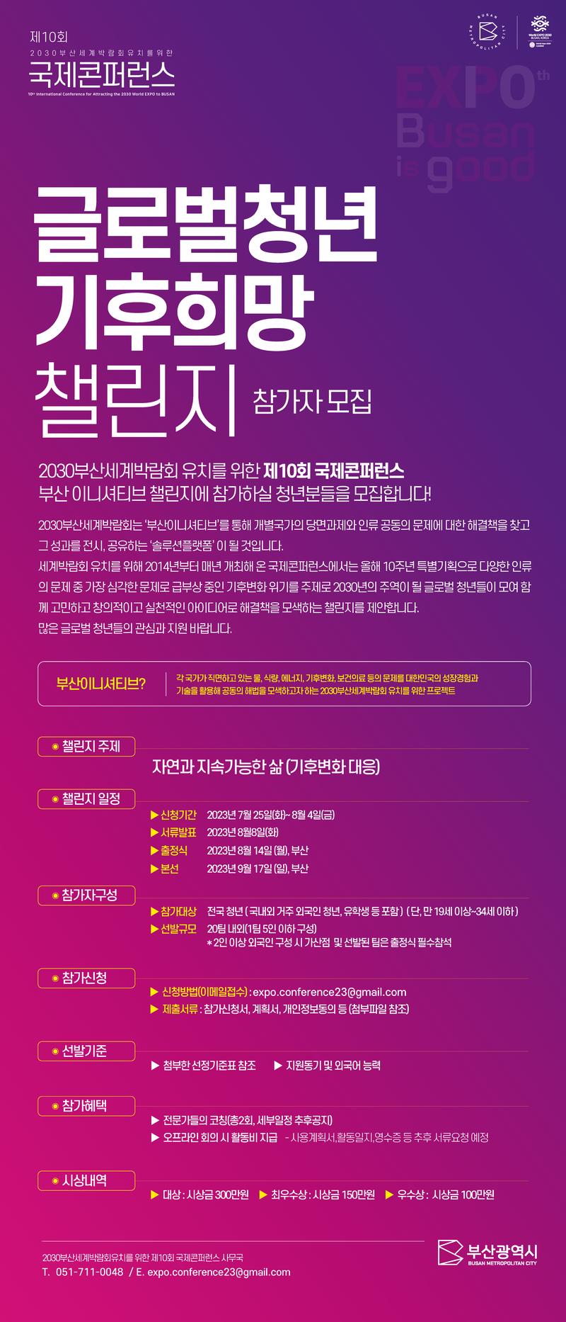 2030부산세계박람회 유치를 위한 제10회 국제콘퍼런스 글로벌청년 기후희망 챌린지에 참가하실 청년분들을 모집합니다! 2030부산세계박람회는 ‘부산이니셔티브’를 통해 개별국가의 당면과제와 인류 공동의 문제에 대한 해결책을 찾고 그 성과를 전시, 공유하는 ‘솔루션플랫폼’ 이 될 것입니다. 세계박람회 유치를 위해 2014년부터 매년 개최해 온 국제콘퍼런스에서는 올해 10주년 특별기획으로 다양한 인류의 문제 중 가장 심각한 문제로 급부상 중인 기후변화 위기를 주제로 2030년의 주역이 될 글로벌 청년들이 모여 함께 고민하고 창의적이고 실천적인 아이디어로 해결책을 모색하는 챌린지를 제안합니다. 많은 글로벌 청년들의 관심과 지원 바랍니다. *부산이니셔티브 : 각 국가가 직면하고 있는 물, 식량, 에너지, 기후변화, 보건의료 등의 문제를 대한민국의 성장경험과 기술을 활용해 공동의 해법을 모색하고자 하는 프로젝트 ■ 챌린지 주제 • 자연과 지속가능한 삶(기후변화 대응) ■ 챌린지 일정 • 신청기간: 2023년 7월 25일(화)\~ 8월 4일(금) • 서류발표 : 2023년 8월8일(화) • 출정식: 2023년 8월 14일 (월), 부산 • 본선: 2023년 9월 17일 (일), 부산 ■ 참가자구성 • 참가대상: 전국 청년 (국내외 거주 외국인 청년, 유학생 등 포함) (단, 만 19세 이상\~34세 이하) • 선발규모: 20팀 내외(1팀 5인 이하 구성) *2인 이상 외국인 구성 시 가산점 및 선발된 팀은 출정식 필수 참석 ■ 참가신청 • 신청방법(이메일접수) : expo.conference23@gmail.com • 제출서류: 참가신청서, 계획서, 개인정보동의 등 (첨부파일 참조) ■ 선발기준 • 첨부한 선정기준표 참조 • 지원동기 및 외국어 능력 ■ 참가혜택 • 전문가들의 코칭(총2회, 세부일정 추후공지) • 오프라인 회의 시 활동비 지급 - 사용계획서,활동일지,영수증 등 추후 서류요청 예정 ■ 시상내역 • 대상 : 시상금 300만원 • 최우수상 : 시상금 150만원 • 우수상 : 시상금 100만원