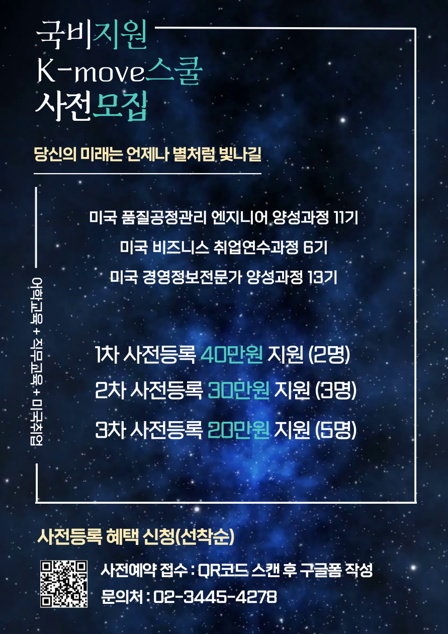 📌연수과정/장소 1. 글로벌청년 인재개발 미국 비즈니스 취업 연수과정 6기 - 서울과학기술대학교 2. 미국 기업맞춤형 품질공정관리 엔지니어 양성과정 11기 - 서울과학기술대학교 3. 미국 경영정보전문가 양성과정 13기 - 고려대학교 세종캠퍼스 ✏️연수구성 ·어학교육 + 직무소양교육 + 미국 인턴(12개월 유급) 🔖연수 기간 ·2023년 10월 말 \~ 2024년 3월 중순 ※학기 중 연수생 수업시간 고려하여 시험기간 휴강 🌏국가 ·미국 전 지역(뉴욕,뉴저지,캘리포니아,텍사스,조지아 등) ⏰사전모집 혜택(선착순) 1차 사전모집 - 40만원 지원(2명) (7/24\~8/18일까지) 2차 사전모집 - 30만원 지원(3명) (8/21\~8/15까지) 3차 사전모집 - 20만원 지원(5명) (9/18\~9/29일까지) ※ 타지역에서 거주하며 타학교에 재학중이거나 졸업 후 1년이내이면서 해당 학교에서 연수를 듣는 경우 혜택이 지원됩니다. ※ 선착순이므로 조기 종료될 수 있습니다. 📞상세문의 - 아이씨엔그룹 ICN Group(역삼동) - 02-3445-4278 - icngroup@icncareer.com - 카카오톡 플러스친구 : @아이씨엔그룹 🔗상담/지원서 제출 ·아래 링크 클릭 or QR코드 스캔 후 구글폼 지원서 제출 ※작성해주신 내용을 토대로 담당자가 연락드립니다. 선착순 신청 바로가기