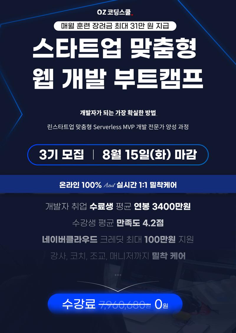 ▶ 모집 일정 모집 인원 : 40명 한정 (내일배움카드 발급 가능한 분) 모집 기간 : 8월 15일 23시 59분 마감 합격 발표 : 모집 기간 내, 상시 발표 수강료 : 800만원 상당 수강료 전액 지원 → 0원