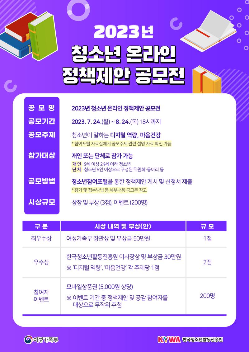 ○ 공모기간 : 2023. 7. 24.(월) \~ 8. 24.(목) 18:00시 까지 ○ 참가대상 : 개인 또는 단체로 참가 가능 -개인: 9세 이상 24세 이하 청소년 -단체: 청소년 5인 이상으로 구성된 위원회, 동아리 등 *단체의 경우: 단체 신청서를 작성하고, 신청서에 명시된 대표 청소년 이름으로 참가신청 및 정책제안 글 작성 ※ 개인정보유출 우려가 있으므로 정책제안 Y-Change 페이지 게시글 내 신청서 첨부하지 않도록 유의바랍니다. ○ 공모주제: 청소년이 말하는 '디지털 역량', '마음건강' (청소년특별회의 20주년 기념 사전 특별과제) ○ 참여자 이벤트는 공모기간 중 정책제안 및 공감참여자(공모주제 외 내용 포함)를 대상으로 진행 ○ 공모기간 전에 '디지털 역량' 또는 '마음건강' 주제로 제안한 정책은 신청양식에 맞춰 보완 후 공모전 신청 가능 ○ 공모 마감인 8.24.(목) 18:00시 까지 공감 수 30건 이상인 정책 제안이 2단계 심사 대상 선정 ○ 자세한 내용은 공지사항 및 첨부파일 확인 부탁드립니다. ○ 문의: (전화) 02-330-2867(2866) (이메일) sontag23@kywa.or.kr