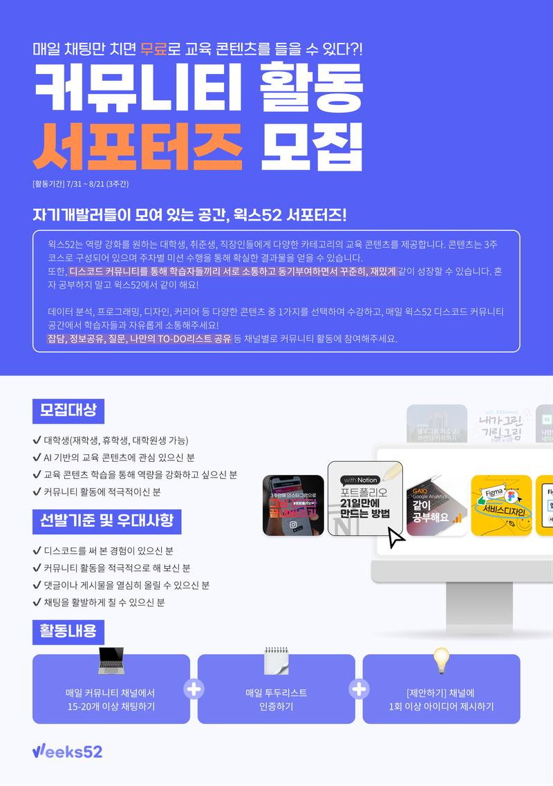 [윅스52 커뮤니티 활동 서포터즈] 데이터 분석, 프로그래밍, 디자인, 커리어 등 다양한 콘텐츠 중 1가지를 선택하여 수강하고, 매일 윅스52 디스코드 커뮤니티 공간에서 학습자들과 자유롭게 소통해주세요! 잡담, 정보공유, 질문, 나만의 TO-DO리스트 공유 등 채널별로 커뮤니티 활동에 참여해주세요.
