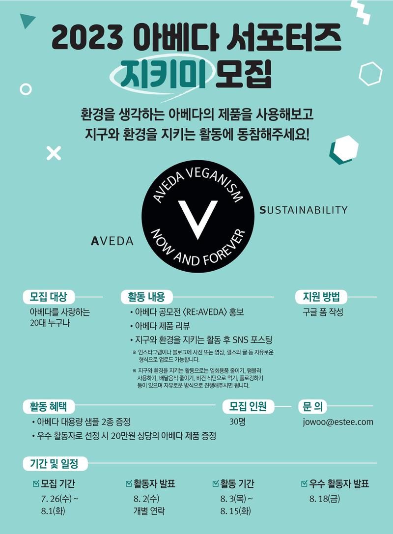 아베다의 지속가능성을 위한 노력과 비건 철학을 널리 알릴 수 있는 2023 아베다 서포터즈 💚지키미💚를 모집합니다.