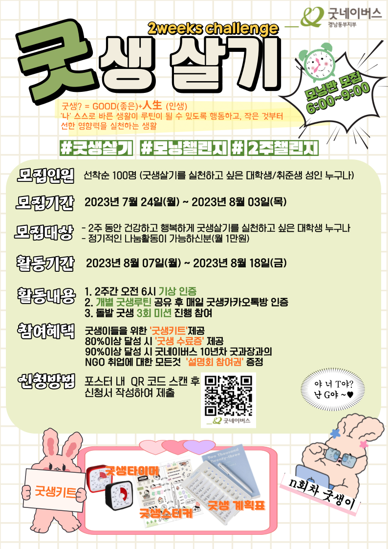 굿생? Good + 人生(인생) = ‘나’ 스스로 바른 생활이 루틴이 될 수 있도록 행동하고, 작은 것부터 선한 영향력을 실천하는 생활