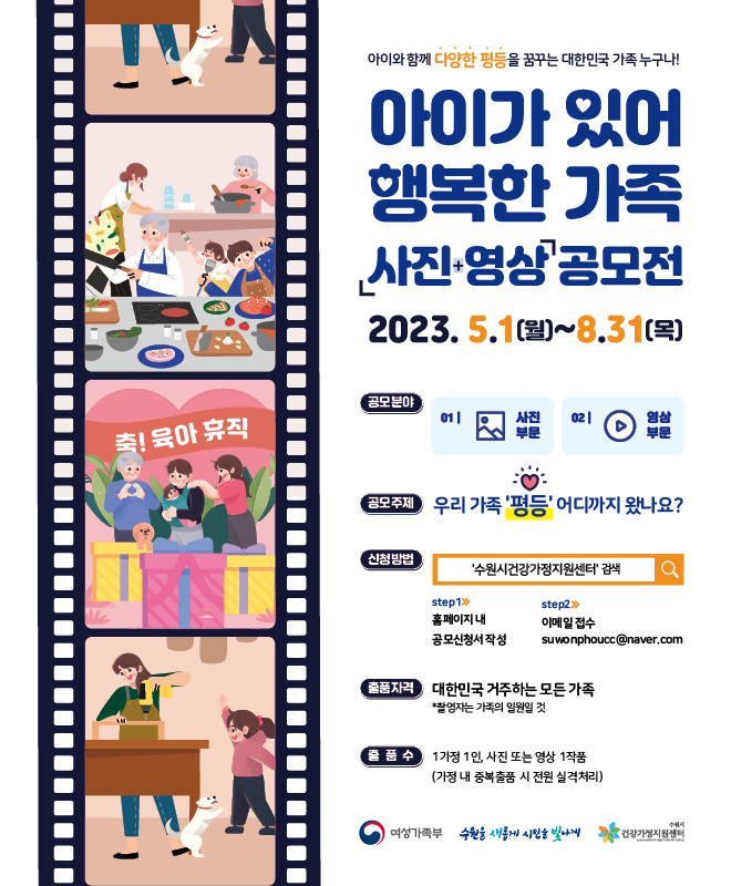 1. 접수기간 : 2023년 5월 1일(월) \~ 8월 31일(목) - 1개월 연장 2. 공모분야 : 사진 / 영상 부문 3. 공모주제 : 우리 가족 ‘평등’ 어디까지 왔나요? 4. 출품자격 : 대한민국 거주하는 모든 가족(1가정\, 1인\, 사진 또는 영상 1작품) 5. 접수방법 : 홈페이지 내 신청서 작성 후 이메일 접수(suwonphoucc@naver.com) 6. 문의사항 : 수원시건강가정지원센터 교육문화팀 최유진 031-245-1310 *링크 : 세부안내 클릭해주세요