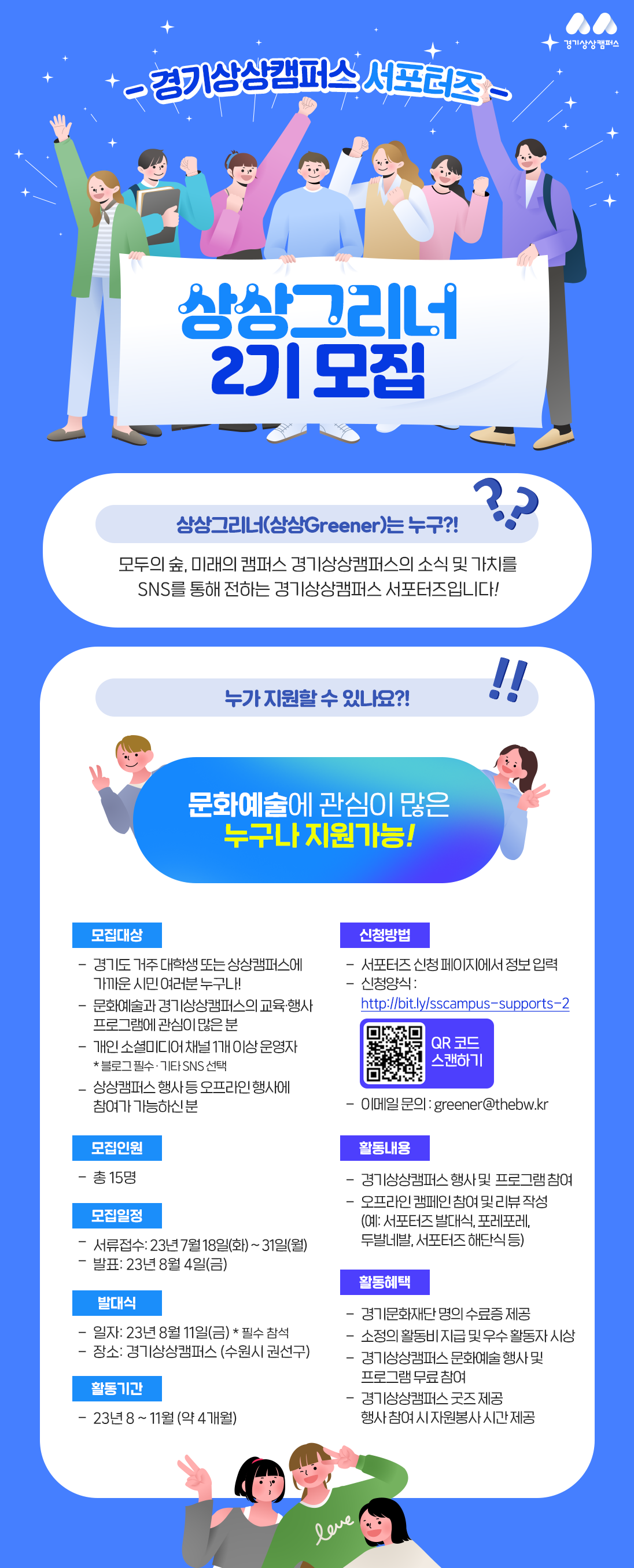 🙋경기상상캠퍼스 서포터즈 상상그리너 2기 모집🙋 수원시에 위치한 경기상상캠퍼스의 다양한 프로그램과 행사에 참여하고 🏘경기상상캠퍼스를 널리 알려주실 서포터즈 상상그리너 2기를 모집합니다!📢 이번 2기는 대학생 뿐만 아니라 문화예술과 상상캠퍼스에 관심있는 분이라면 누구나 참여가 가능한데요! 아래👇 모집 안내글을 참고해 주세요\~! 경기도민 여러분의 많은 관심과 참여 부탁드려요!🤩 <전형일정> - 모집기간 : 2023년 7월 18일(화)\~31일(월) - 합격자 발표 : 2023년 8월 4일(금) - 발대식 : 2023년 8월 11일(금) 오후 2시(예정) *필수 참석 - 활동 기간 : 2023년 8\~11월 (약 4개월)