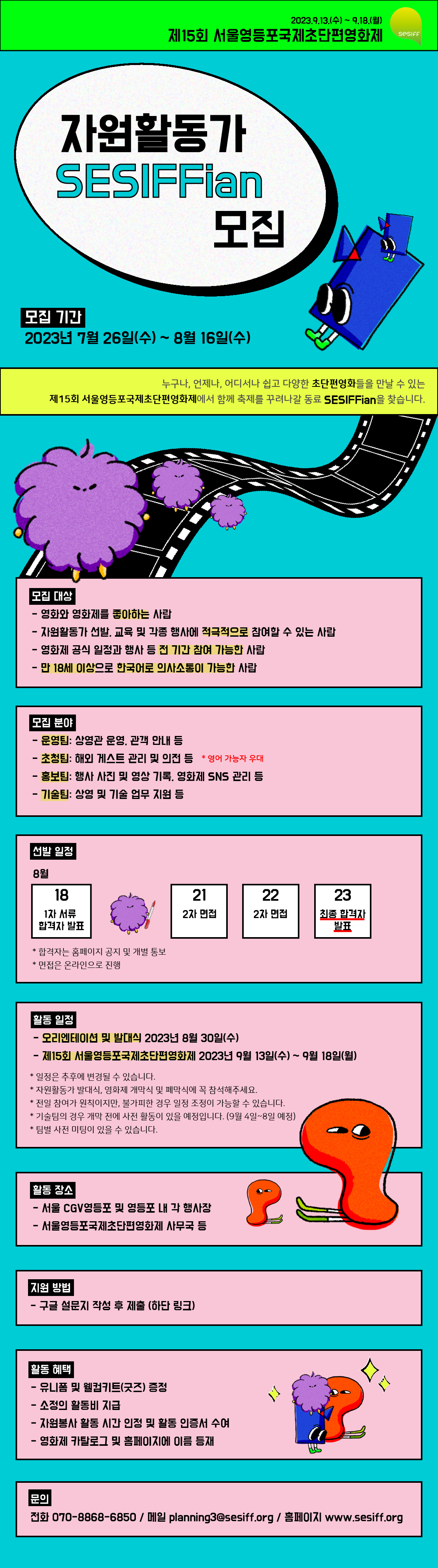 1. 모집 기간: 2023년 7월 26일(수) \~ 8월 16일(수) 2. 모집 대상 영화와 영화제를 좋아하는 사람 자원활동가 선발, 교육 및 각종 행사에 적극적으로 참여할 수 있는 사람 영화제 공식 일정과 행사 등 전 기간 참여 가능한 사람 만 18세 이상으로 한국어로 의사소통이 가능한 사람 3. 모집 분야 운영팀: 상영관 운영, 관객 안내 등 초청팀: 해외 게스트 관리 및 의전 등 *영어 가능자 우대 홍보팀: 행사 사진 및 영상 기록, 영화제 SNS 관리 등 기술팀: 상영 및 기술 업무 지원 등 4. 일정 및 주요 활동 8월 18일(금) : 1차 서류 합격자 발표 및 면접 스케줄 공지 8월 21일(월) \~ 22일(화) : 2차 면접 진행(온라인) 8월 23일(수) : 최종 합격자 발표 (홈페이지 공지 및 개별 통보) 8월 30일(수) : 자원활동가 발대식 및 오리엔테이션 (온라인) 9월 4일(월) \~ 8일(화) : 기술팀 사전 업무 (상영본 검수) 9월 13일(수) \~ 9월 18일(월) : 영화제 기간 활동 5. 활동 장소 서울 CGV영등포 및 영등포 내 각 행사장 서울영등포국제초단편영화제 사무국 등 6. 지원 방법 구글 설문지 작성 후 제출 링크: https://forms.gle/KPpkGcF7VppYRRdE9 7. 활동 혜택 유니폼 및 웰컴키트(굿즈) 증정 소정의 활동비 지급 자원봉사 활동 시간 인정 및 활동 인증서 수여 영화제 카탈로그 및 홈페이지에 이름 등재 8. 참고 사항 *일정은 추후에 변경될 수 있습니다. *자원활동가 발대식, 영화제 개막식 및 폐막식에 꼭 참석해 주세요. *전일 참여가 원칙이지만, 불가피한 경우 일정 조정이 가능할 수 있습니다. *기술팀의 경우 영화제 전에 사전활동이 있을 예정입니다. (9월 4일\~8일 예정) *팀별 사전 미팅이 있을 수 있습니다. 9. 문의 Tel. 070-8868-6850 / E-mail. planning3@sesiff.org - 홈페이지: https://www.sesiff.org/2023/