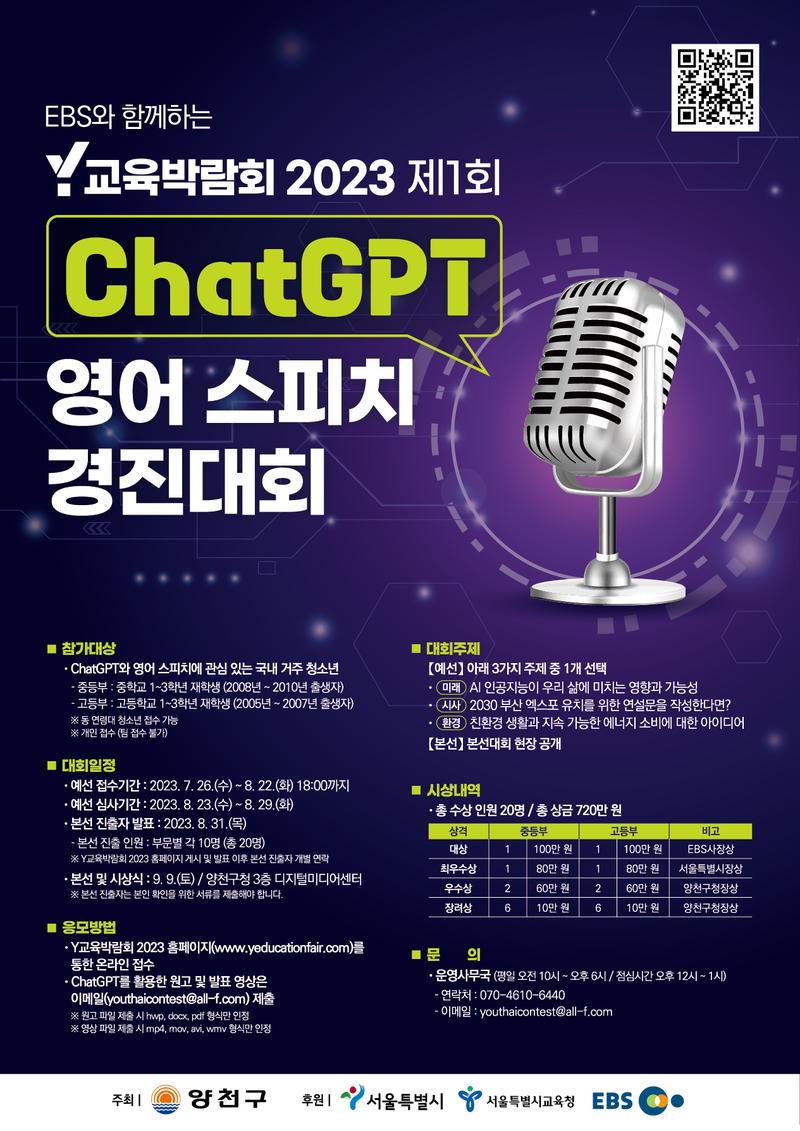 hatGPT의 등장과 함께 AI의 관심과 활용 능력의 중요성이 커진 2023년, 스스로 질문하고 주어진 답변을 통해 문제를 해결하는 노력 속에서 학생들의 생성형 AI 학습 역량 및 창의력과 논리력을 높이고, 이를 통해 미래형 인재를 발굴하고자 ChatGPT 영어 스피치 경진대회를 개최합니다. △ 참가 대상 - ChatGPT와 영어 스피치에 관심 있는 국내 거주 청소년 · 중등부 : 중학교 1\~3학년 재학생 (2008년 \~ 2010년 출생자) · 고등부 : 고등학교 1\~3학년 재학생 (2005년 \~ 2007년 출생자) ※ 동 연령대 청소년 접수 가능 ※ 개인 접수 (팀 접수 불가) △ 대회 주제 - [예선] 아래 3가지 주제 중 1개 선택 (미래) AI 인공지능이 우리 삶에 미치는 영향과 가능성 (시사) 2030 부산 엑스포 유치를 위한 연설문을 작성한다면? (환경) 친환경 생활과 지속 가능한 에너지 소비에 대한 아이디어 - [본선] 본선대회 현장 공개 △ 발표 시간 - (예선) 전체 3분 - (본선) 전체 3분 ※ 자기소개 20초 이내 △ 대회 일정 - 예선 접수기간 : 2023년 7월 26일(수) \~ 8월 22일(화) 18:00까지 - 예선 심사기간 : 2023년 8월 23일(수) \~ 8월 29일(화) - 본선 진출자 발표 : 2023년 8월 31일(목) · 본선 진출 인원 : 부문별 각 10명 (총 20명) ※ Y교육박람회 2023 홈페이지 게시 및 발표 이후 본선 진출자 개별 연락 - 본선 및 시상식 : 9월 9일(토) / 양천구청 3층 디지털미디어센터 ※ 본선 진출자는 본인 확인을 위한 서류를 제출해야 합니다. ※ 대회 일정은 주최사의 사정에 따라 변동될 수 있습니다. △ 응모방법 - Y교육박람회 2023 홈페이지(www.yeducationfair.com)를 통한 온라인 접수 - ChatGPT를 활용한 원고 및 발표 영상은 이메일 제출 (youthaicontest@all-f.com) ※ 원고 파일 제출 시 hwp, docx, pdf 형식만 인정 ※ 영상 파일 제출 시 mp4, mov, avi, wmv 형식만 인정 △ 시상내역 - 총 상금 720만 원 / 총 수상 인원 20명 [중등부] - 대상 (1) 100만 원 / 상격 : EBS사장상 - 최우수상 (1) 80만 원 / 상격 : 서울특별시장상 - 우수상 (2) 60만 원 / 상격 : 양천구청장상 - 장려상 (6) 10만 원 / 상격 : 양천구청장상 [고등부] - 대상 (1) 100만 원 / 상격 : EBS사장상 - 최우수상 (1) 80만 원 / 상격 : 서울특별시장상 - 우수상 (2) 60만 원 / 상격 : 양천구청장상 - 장려상 (6) 10만 원 / 상격 : 양천구청장상 ※ 출품 및 심사 결과에 따라 시상을 가감하거나 시상하지 않을 수도 있습니다. ※ 시상금의 제세공과금은 본인 부담으로 합니다. △ 심사 기준 · 주제 구성력 (주제 적합성 및 창의성) · 주제 전달력 (어휘력 등 표현 및 문법, 설득력, 논리력) · 생성형 AI 활용능력 (데이터 추출 및 가공 능력) · 발표 능력 (음성, 태도 및 자신감, 시간 관리) △ 문의 - 운영사무국 · 연락처 : 070-4610-6440 · 이메일 : youthaicontest@all-f.com (평일 오전 10시 \~ 오후 6시 / 점심시간 오후 12시 \~ 1시) △ 대회 유의사항 - 자세한 내용은 홈페이지 참고