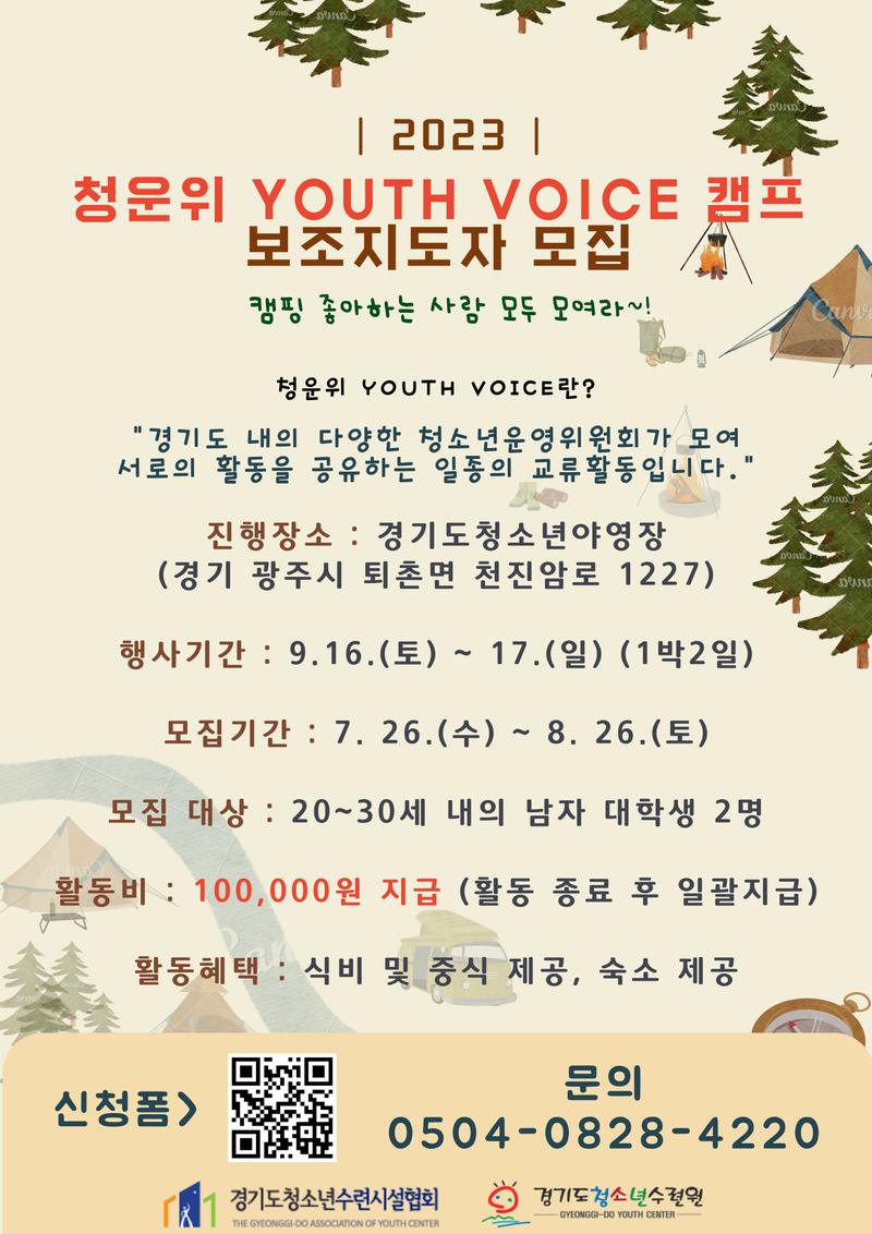 ○ 공모개요 - 경기도청소년수련시설협회에서 진행하는 'Youth Voice'캠프에서 대학생 보조지도자를 모집하오니 많은 신청 바랍니다.