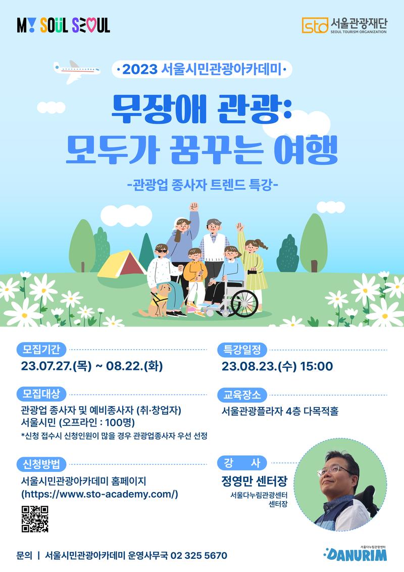 ✅모집기간 : 23.7.27.(목)\~8.22.(화) ✅모집대상 : 관광업 종사자 및 예비종사자 (취/창업자), 서울시민 100명 ✅특강일정 : 23.8.23.(수) 15:00 \~ 17:00 ✅교육장소 : 서울관광플라자 4층 다목적홀